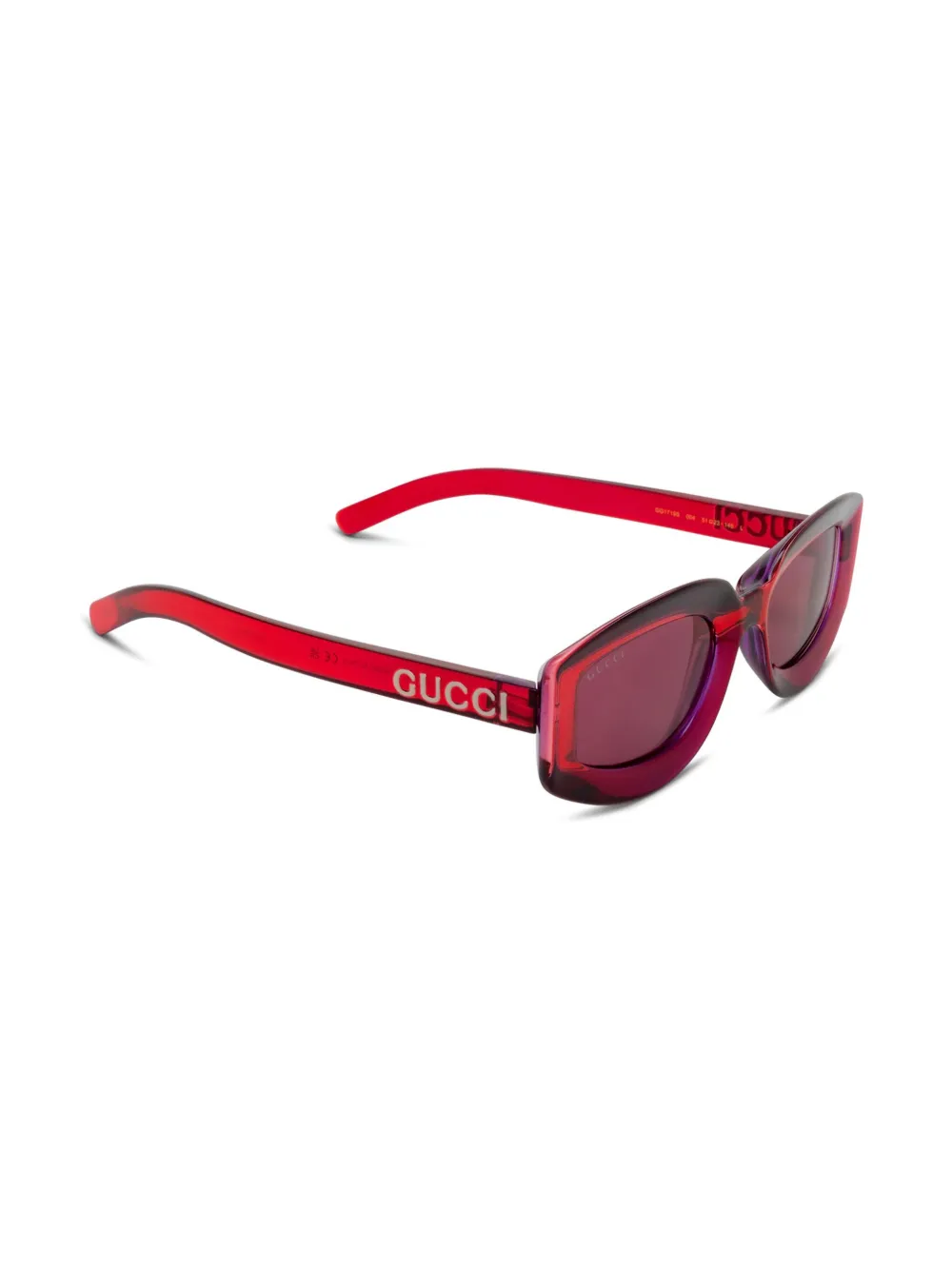 bordeauxrood/helderrood acetaat ovaal montuur rode glazen rechte pootjes logoprint op de brillenpoot gebogen uiteinden Deze bril wordt verkocht met een beschermhoes.