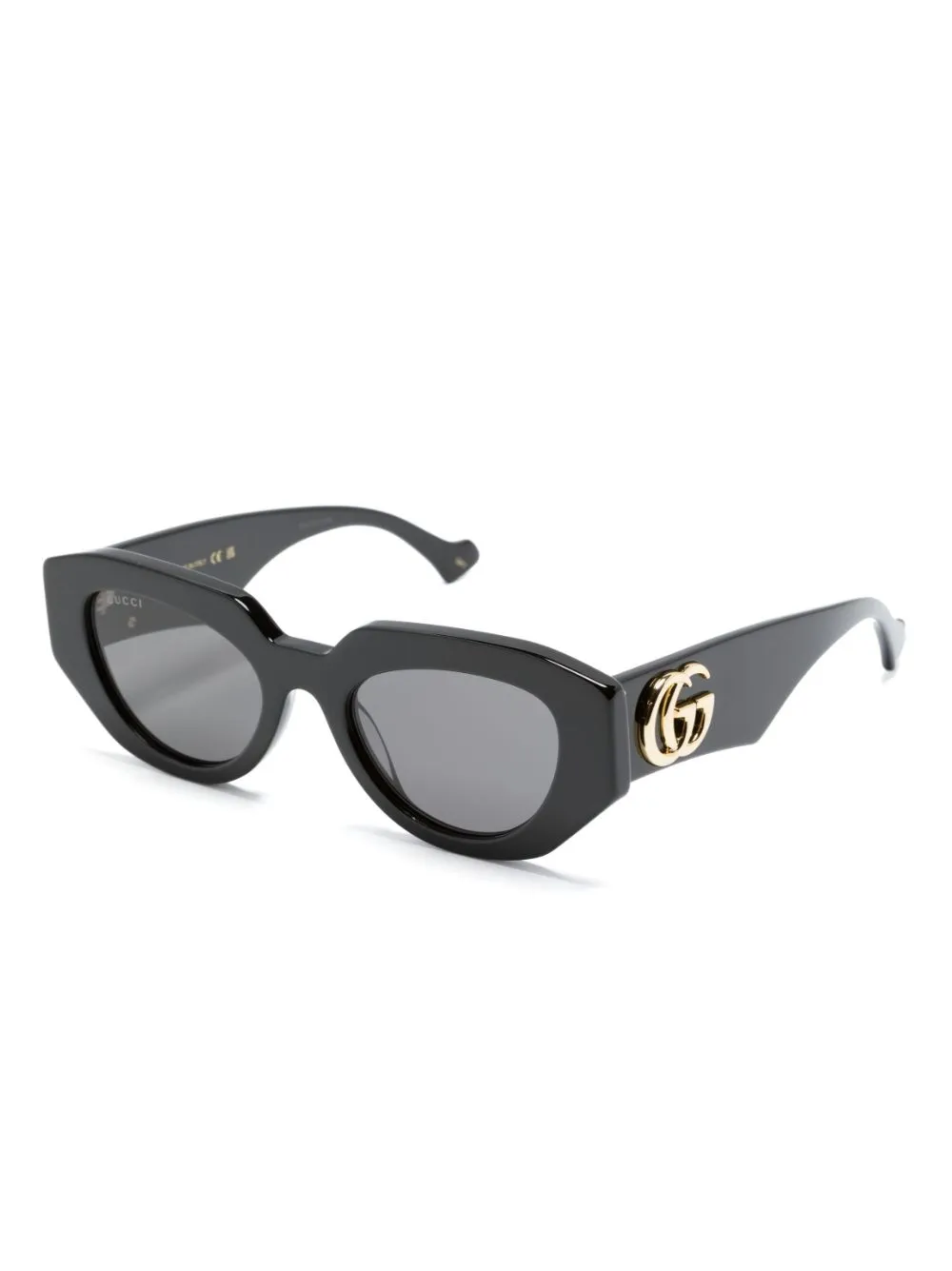 Zwart, acetaat, kenmerkend GG-logo, geometrisch montuur, grijze glazen, glazen met UV-bescherming, geschulpte pootjes en gebogen uiteinde. Deze bril wordt verkocht met een beschermhoes..