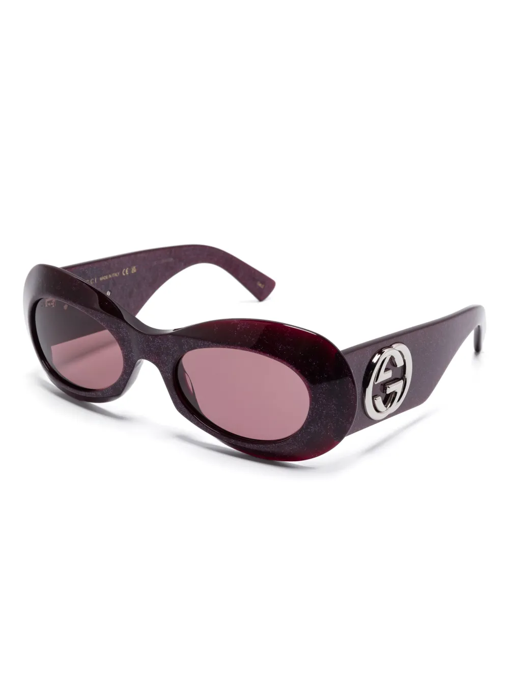 donkerviolet glitterdetail ovaal montuur paarse glazen glazen met UV-bescherming lens sticker kenmerkend GG-logo oversized pootjes gebogen uiteinden Deze bril wordt verkocht met een beschermhoes.