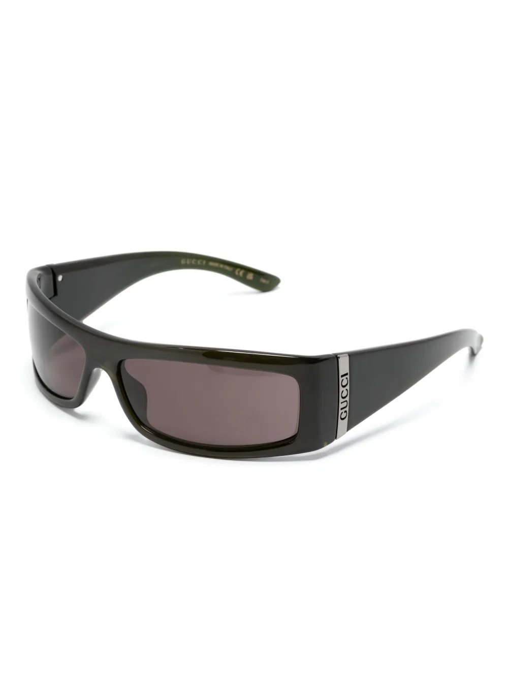 Cederbruin, acetaat, zilverkleurig logo, rechthoekig montuur, bruine glazen, rechte pootjes en gebogen uiteinde. Deze bril wordt verkocht met een beschermhoes..