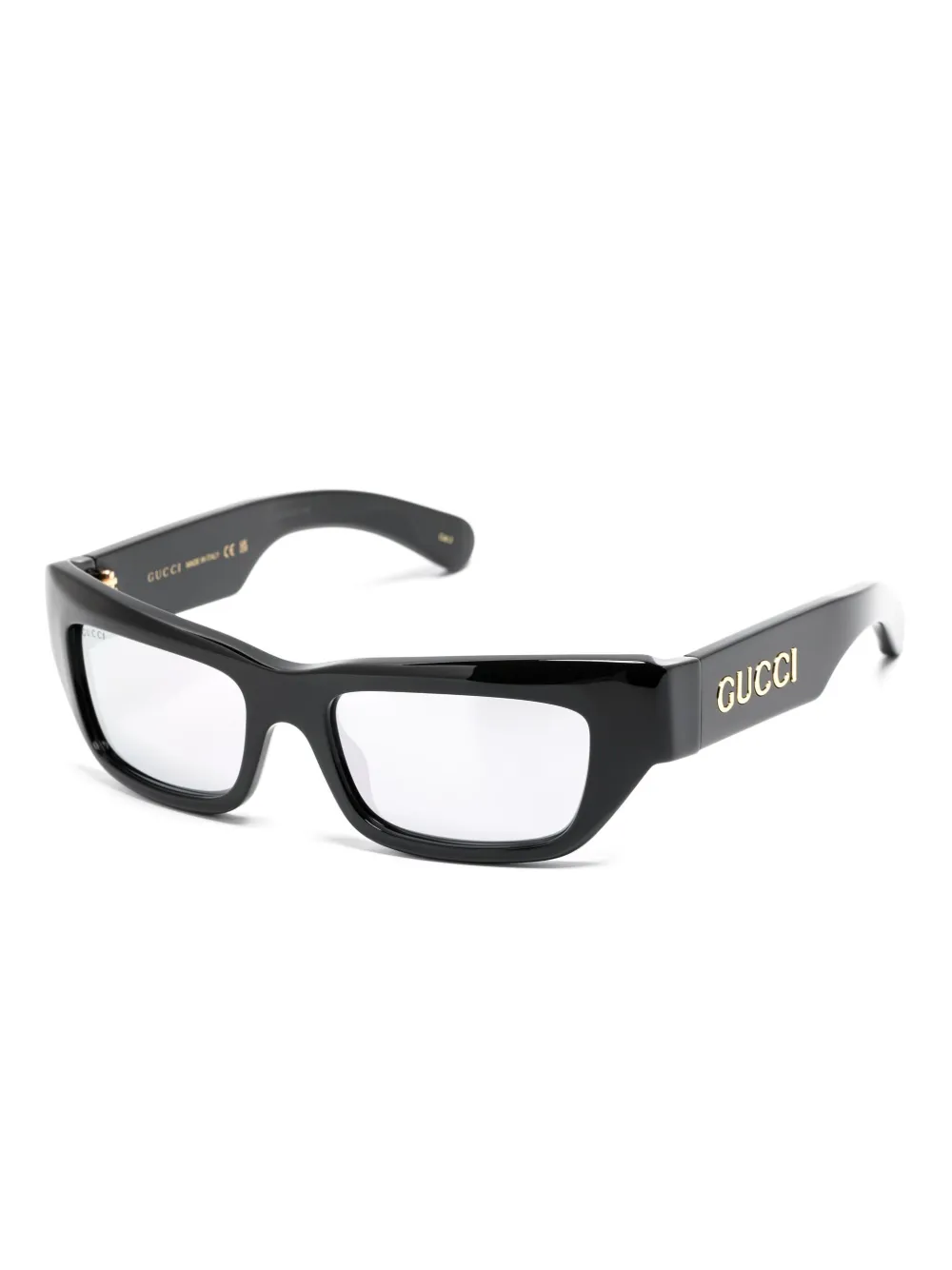 zwart acetaat rechthoekig montuur gespiegelde glazen logo bedrukt pootje rechte poten met gebogen uiteinden Deze bril wordt verkocht met een beschermhoes.
