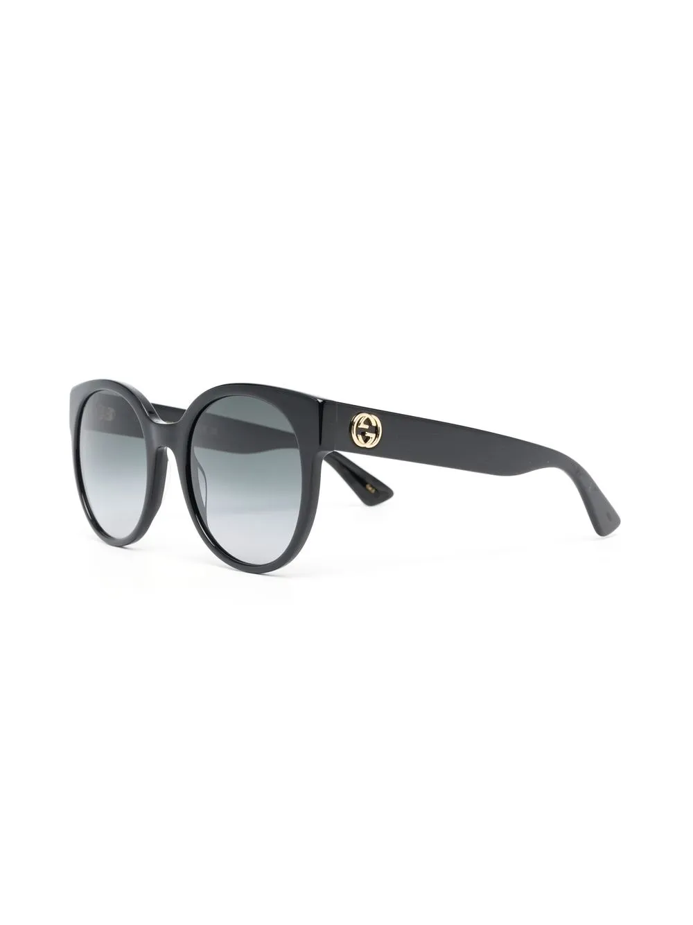Gitzwart, acetaat, goudkleurig logo, rond montuur, grijze glazen, neuskussentjes, rechte pootjes, gebogen uiteinde en glazen met UV-bescherming. Deze bril wordt verkocht met een beschermhoes..
