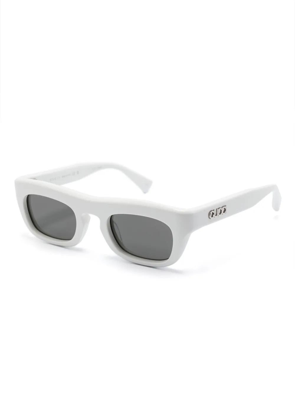 wit hoogglans detail vierkant montuur grijze glazen glazen met UV-bescherming logo bedrukt pootje geschulpte pootjes gebogen uiteinden Deze bril wordt verkocht met een beschermhoes.