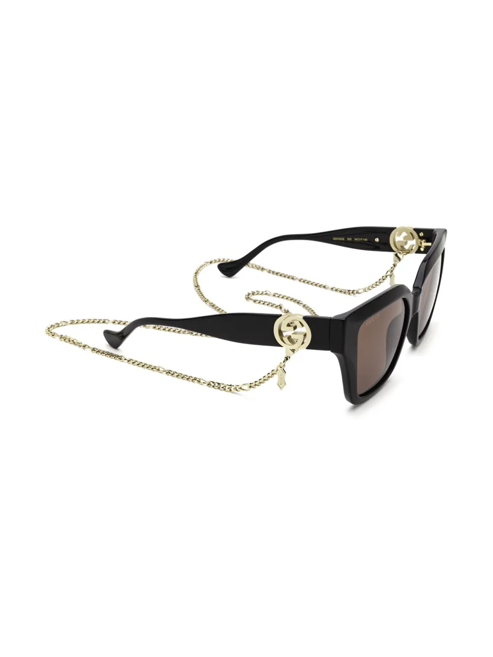 Vierkant montuur, bruine glazen, logoplakkaat op het pootje, gewelfde pootjes en schakel halskoord. Deze bril wordt verkocht met een beschermhoes..