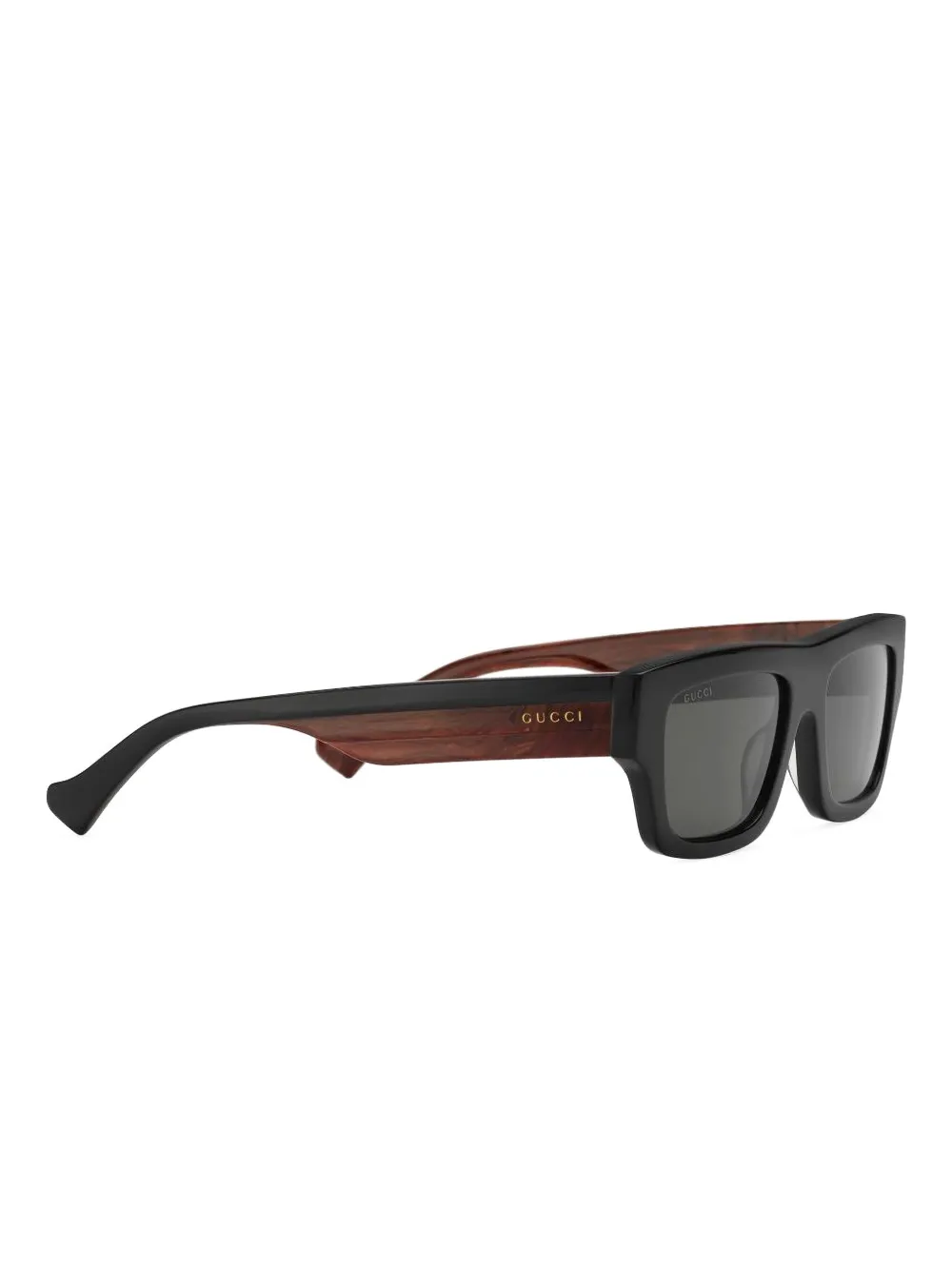 Zwart, vierkant montuur, gekleurde glazen, logoprint op het pootje, design met vlakken, rechte pootjes en gebogen uiteinde. Deze bril wordt verkocht met een beschermhoes..