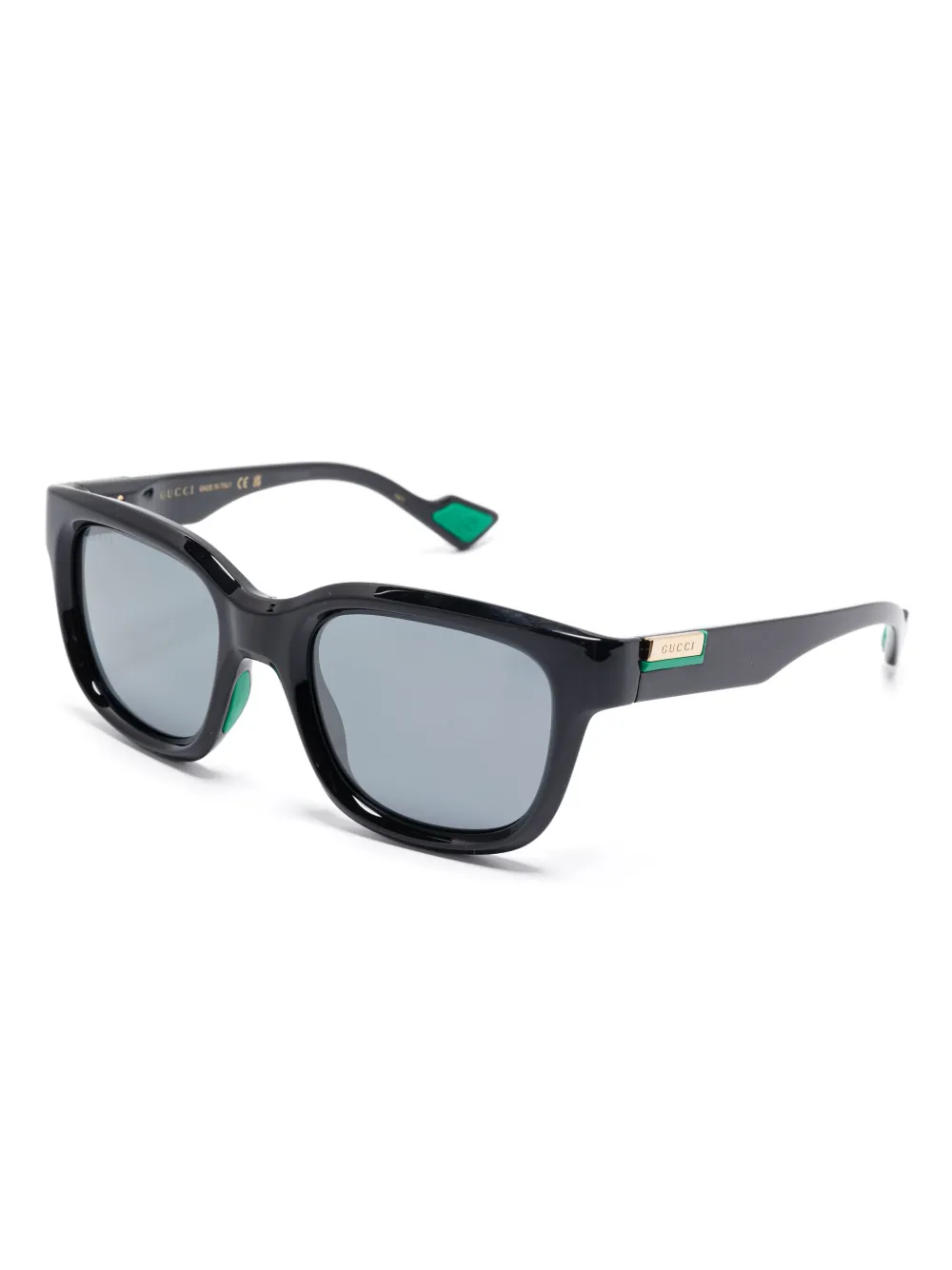 zwart acetaat vierkant montuur gekleurde glazen lens sticker logoplakkaat op de poot rechte pootjes gebogen uiteinden Deze bril wordt verkocht met een beschermhoes.