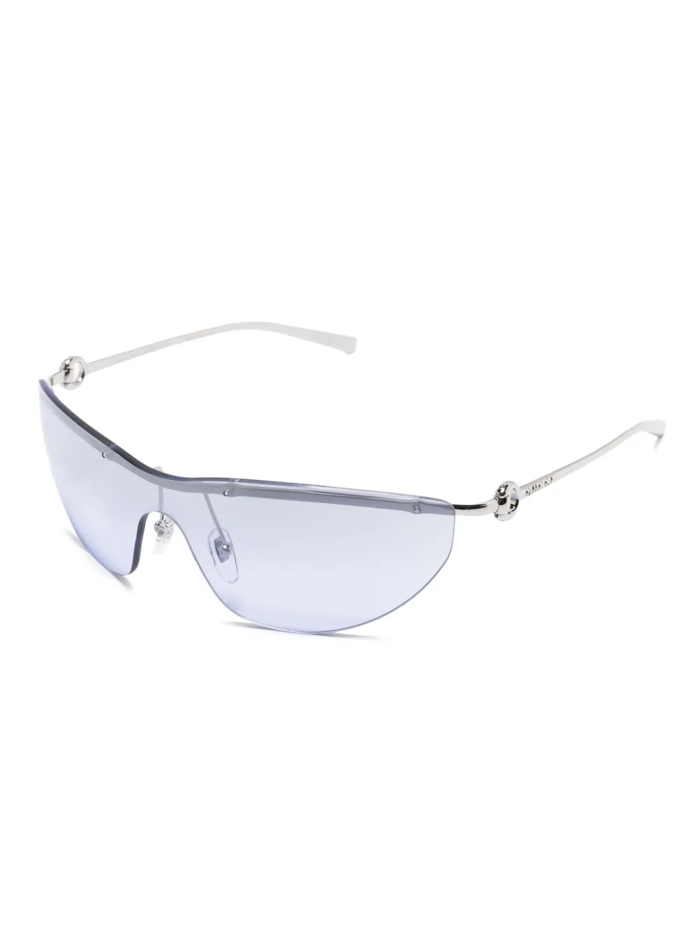 zilverkleurig metaal wrap-around montuur randloze glazen blauwe glazen neuskussentjes bewerkte pootjes en gewelfde uiteinden Deze bril wordt verkocht met een beschermhoes.