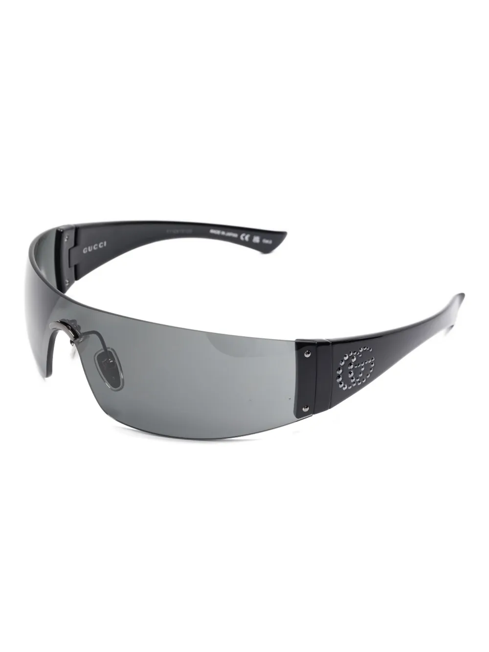 zwart shield montuur grijze glazen logodetail met kristallen Deze bril wordt verkocht met een beschermhoes.