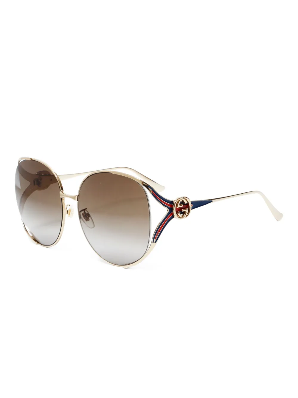 2000s goud cat-eye montuur bruine glazen met kleurverloop metalen frame logodetail op het pootje Deze bril wordt verkocht met een beschermhoes. Staat: GOED. Dit item is eerder in iemands bezit geweest en gebruikt, maar verkeert in goede staat met minimale gebruikssporen. Dit kan vervaging van materiaal of plating en krassen omvatten.