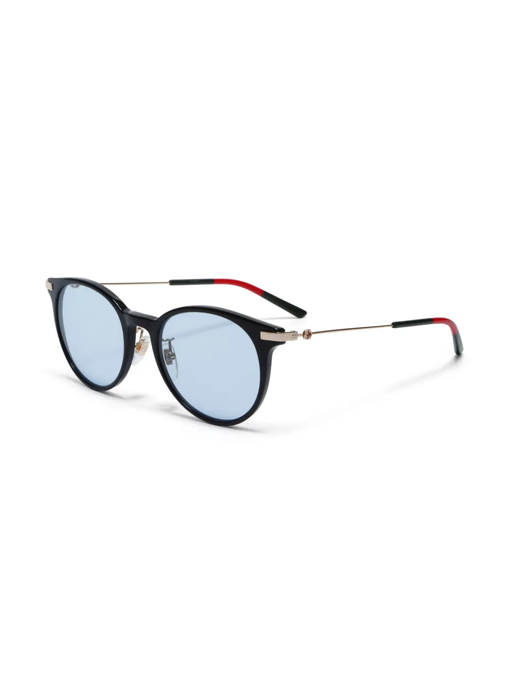zwart rond montuur blauwe glazen logoplakkaat op de poot rechte pootjes gebogen uiteinden Staat: GOED. Dit item is eerder in iemands bezit geweest en gebruikt, maar verkeert in goede staat met minimale gebruikssporen. Dit kan vervaging van materiaal of plating en krassen omvatten.