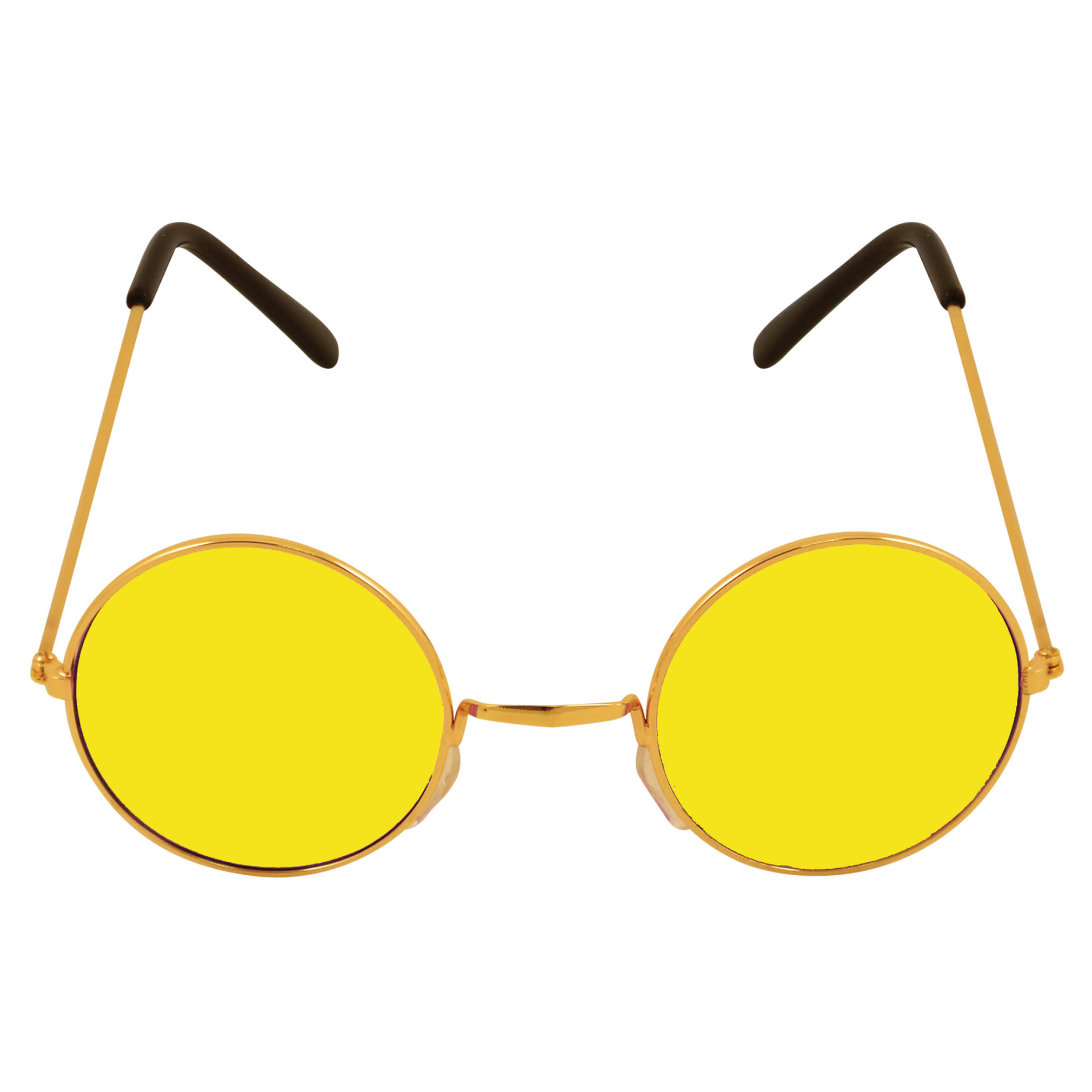Carnaval hippie flower power sixties verkleed zonnebril in het geel met een gouden frame en ronde glazen. Ideaal om uw verkleedset of oufit compleet te maken met deze hippie party bril. Materiaal: metaal/glas. Voor volwassenen.