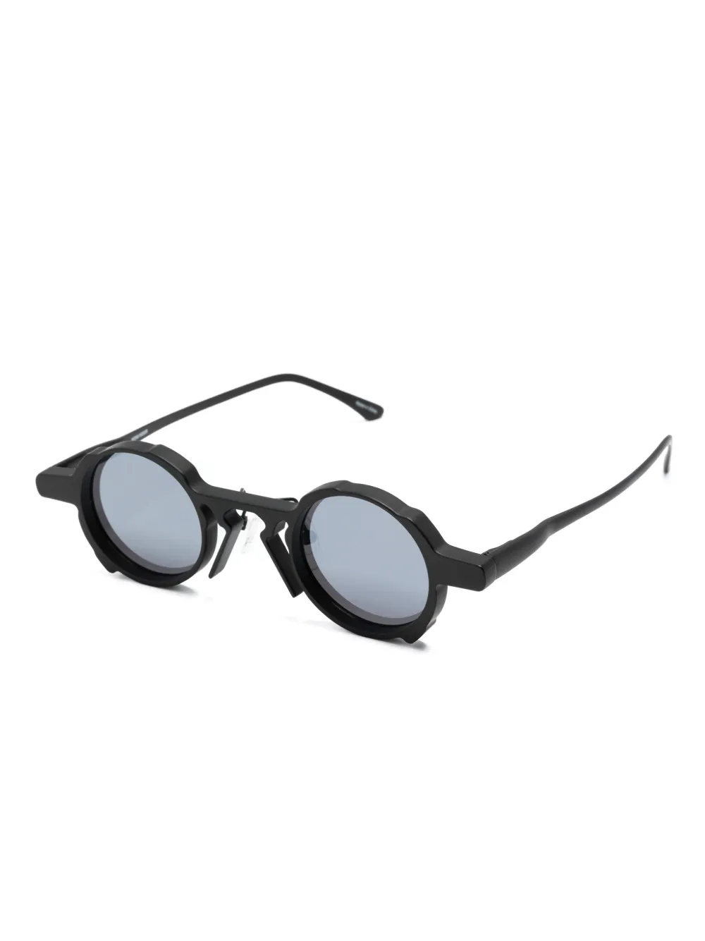 zwart titanium matte afwerking rond montuur met bewerkte details neuskussentjes gespiegelde glazen rechte pootjes gebogen uiteinden Deze bril wordt verkocht met een beschermhoes.