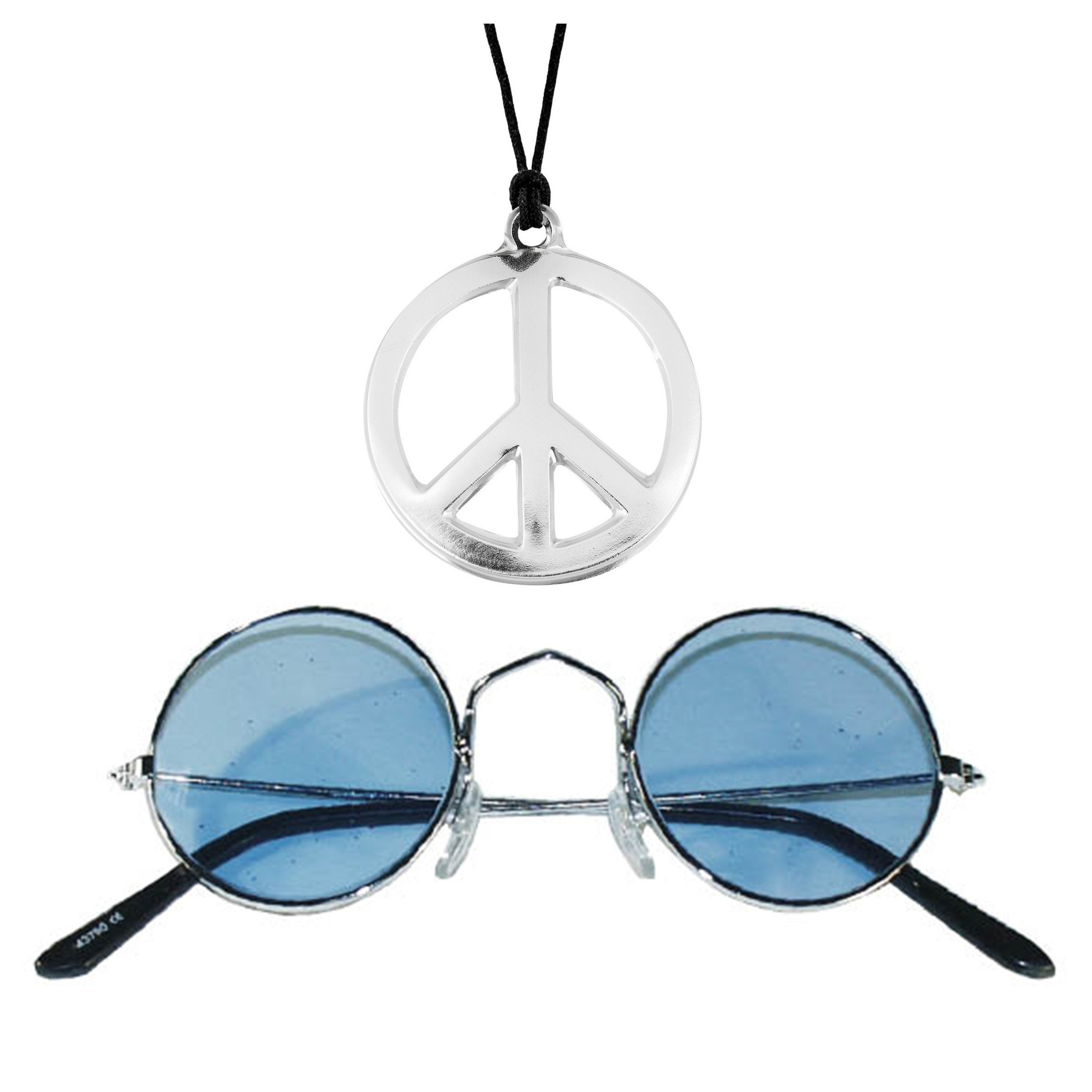 Hippie Flower Power Sixties sieraden peace teken ketting met groovy bril met ronde blauwe glazen. Materiaal: pvc. Maak uw Hippie/sixties verkleedkleding set compleet met deze bijpassende sieraden. , Dit artikel bestaat uit:, 1x Hippie Flower Power ketting – peace teken – Sixties sieraden – 60s – jaren 60, 1x Faram Party carnaval zonnebril – Hippie Flower Power Sixties – ronde glazen – blauw