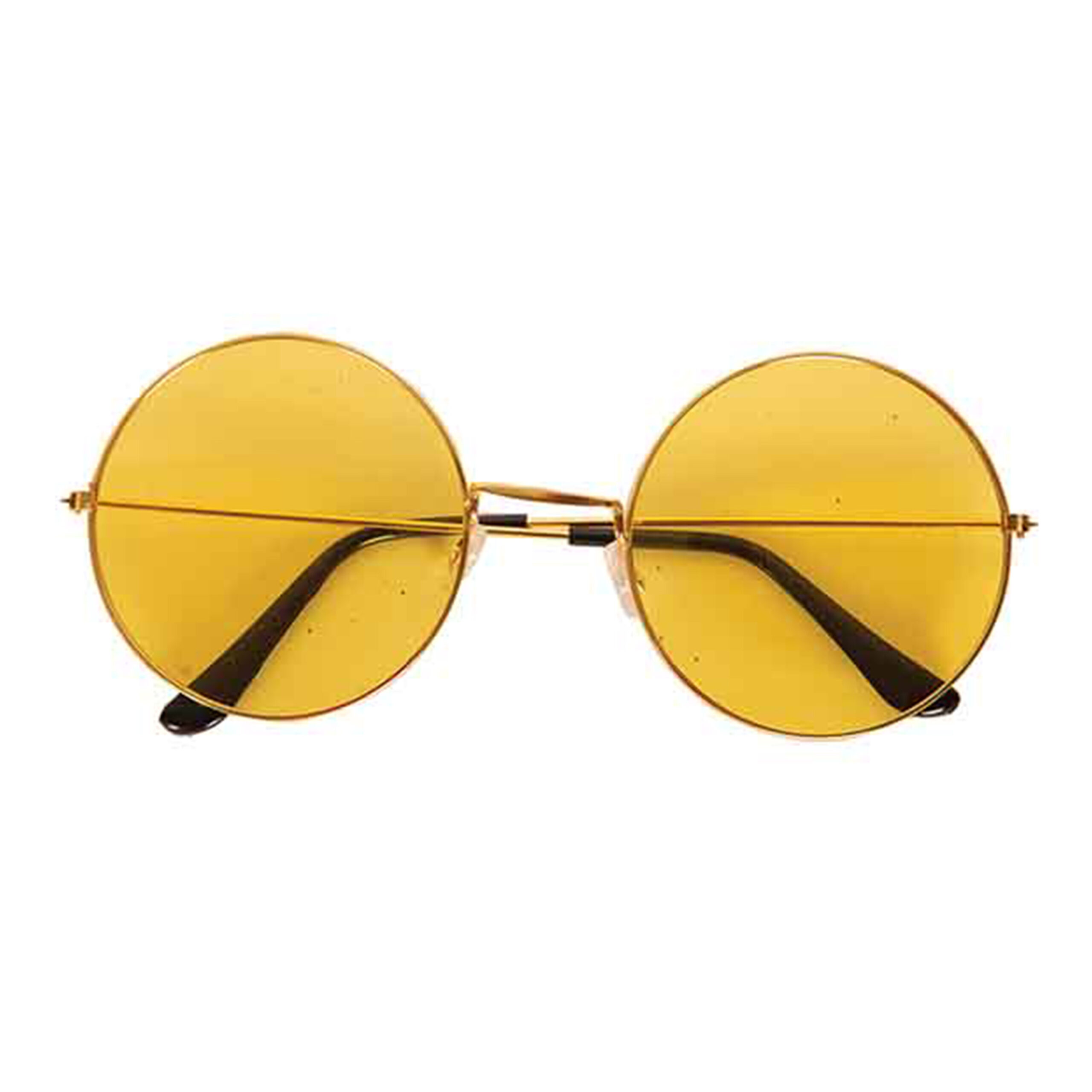 Hippie Flower Power Sixties ronde glazen zonnebril geel. Materiaal: metaal/plastic. Maak uw verkleedkleding set compleet met deze bijpassende party brillen.