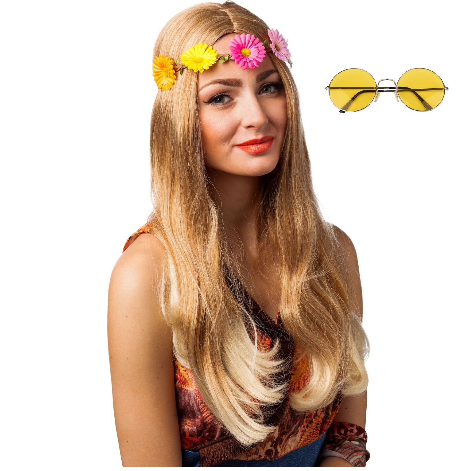 Hippie Flower Power Sixties thema verkleed set voor volwassenen bestaande uit een bloemen hoofdband met een party ronde zonnebril met gele glazen. Basis verkleed spullen om helemaal groovy voor de dag te komen. Let op: dit is een verkleedaccessoire voor volwassenen, geen speelgoed. , Dit artikel bestaat uit:, 1x Carnaval/festival hippie flower power hoofdband gekleurde bloemen – Verkleed accessoires – dames, 1x Party zonnebril – Hippie Flower Power Sixties – grote XL ronde glazen – geel