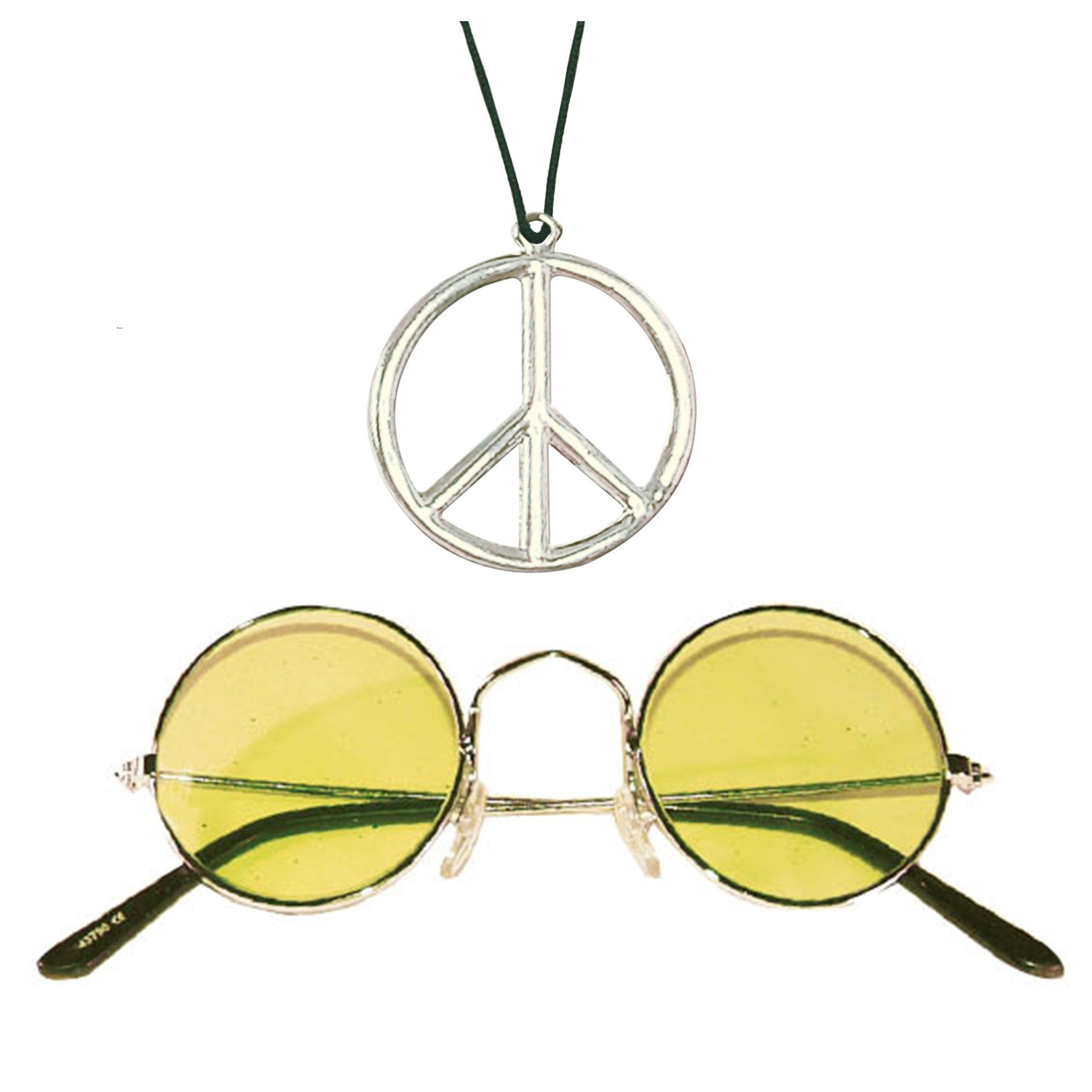 Hippie Flower Power Sixties thema verkleed set voor volwassenen bestaande uit een peace-teken ketting met een party ronde zonnebril met gele glazen. Basis verkleed spullen om helemaal groovy voor de dag te komen. Let op: dit is een verkleedaccessoire voor volwassenen, geen speelgoed. , Dit artikel bestaat uit:, 1x Peace teken ketting – Hippie – Flower Power – Sixties sieraden, 1x Faram Party carnaval zonnebril – Hippie Flower Power Sixties – ronde glazen – geel