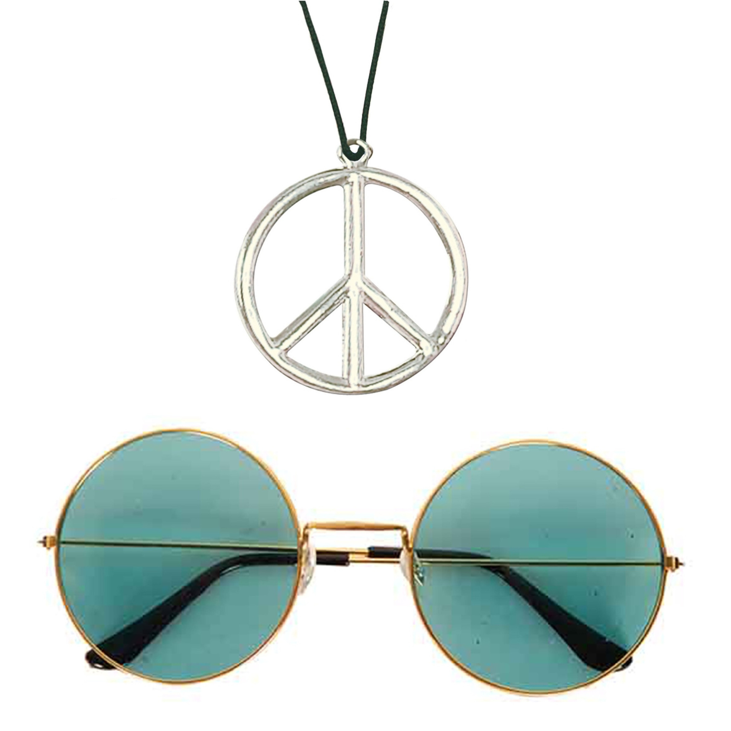 Hippie Flower Power Sixties thema verkleed set voor volwassenen bestaande uit een peace-teken ketting met een party ronde zonnebril met groene glazen. Basis verkleed spullen om helemaal groovy voor de dag te komen. Let op: dit is een verkleedaccessoire voor volwassenen, geen speelgoed. , Dit artikel bestaat uit:, 1x Peace teken ketting – Hippie – Flower Power – Sixties sieraden, 1x Faram Party Zonnebril – Hippie Flower Power Sixties – ronde glazen – groen