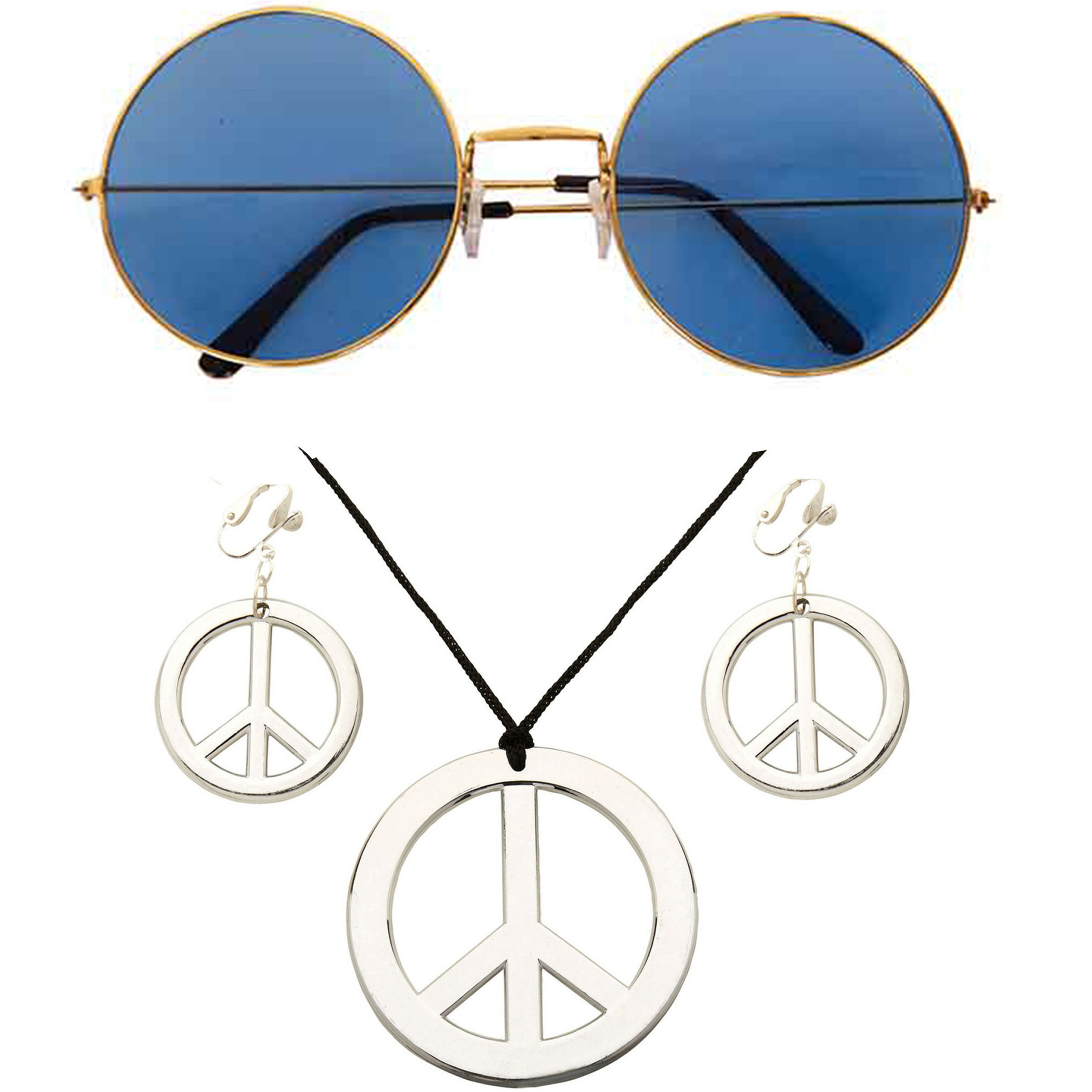 Hippie Flower Power Sixties thema verkleed sieraden set voor volwassenen bestaande uit een peace-teken ketting en oorbellen met een party ronde zonnebril met blauwe glazen. Basis verkleed spullen om helemaal groovy voor de dag te komen. , Dit artikel bestaat uit:, 1x Verkleed sieraden set – Peace teken – Hippie – Flower Power – Sixties – ketting met oorbellen , 1x Faram Hippie zonnebril – blauw – flower power – 60s – ronde glazen