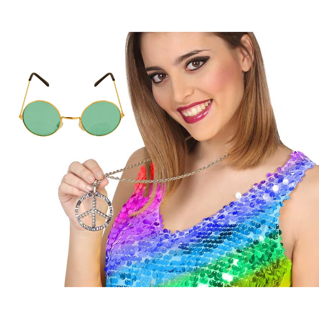 Hippie Flower Power of Sixties verkleed accessoires setje voor dames en heren bestaande uit een peace teken ketting in het zilver en een verkleed bril met ronde glazen in het groen. Materiaal: kunststof/metaal. Zo ben je snel helemaal in je rol. Carnaval thema verkleedkleding accessoires voor bij je outfit. Wat je nog kan toevoegen: kostuum, joint, pruik, hoed. , Dit artikel bestaat uit:, 1x Grote bling hippie sixties verkleed ketting met vredesteken, 1x Carnaval verkleedbril – ronde glazen – groen – flower power – hippie