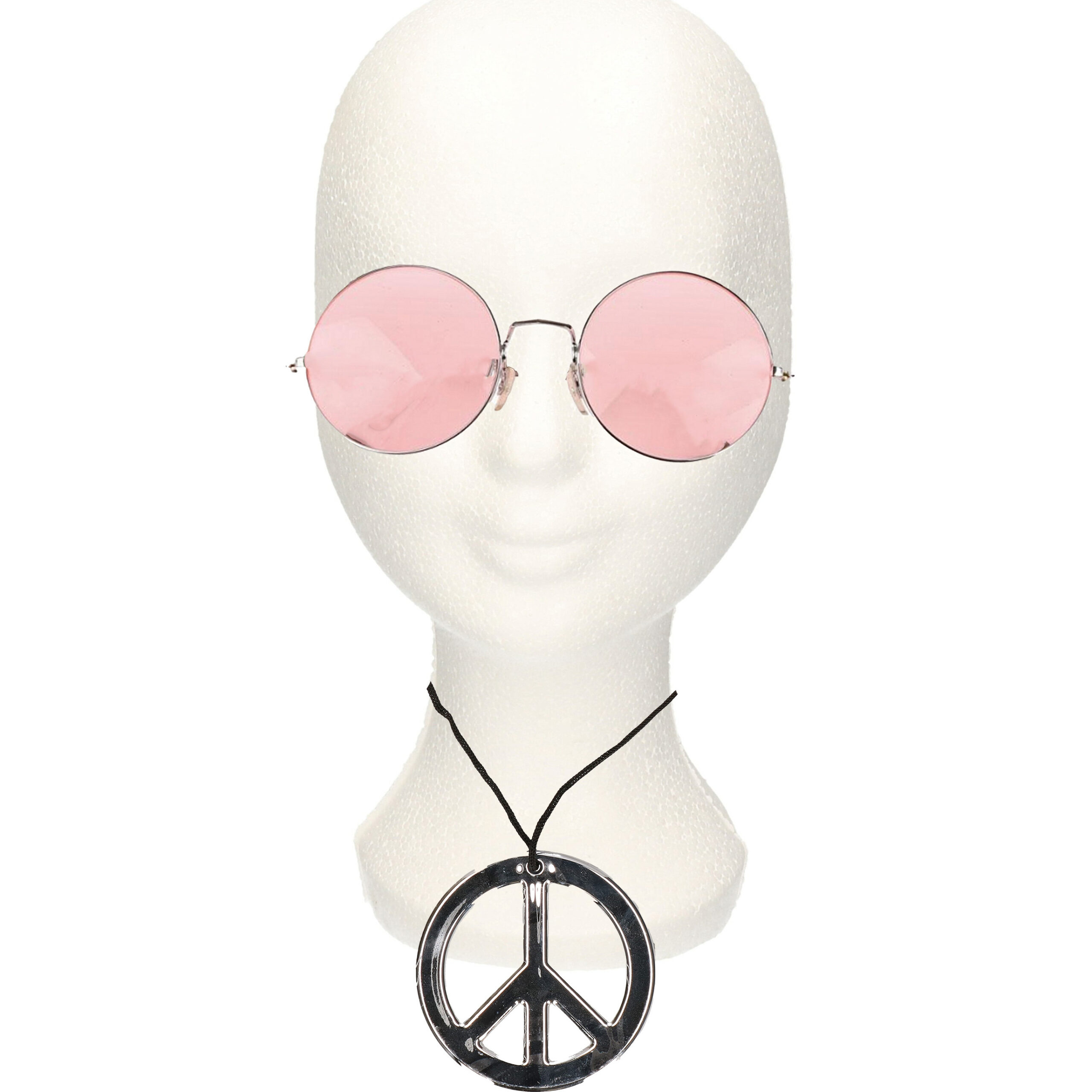 Hippie Flower Power thema verkleed set voor volwassenen bestaande uit een peace-teken ketting met een party ronde zonnebril met roze XL glazen. Let op: dit is een verkleedaccessoire voor volwassenen, geen speelgoed. , Dit artikel bestaat uit:, 1x Hippie Flower Power Peace teken verkleed ketting, 1x Party zonnebril – Hippie Flower Power Sixties – grote XL ronde glazen – roze