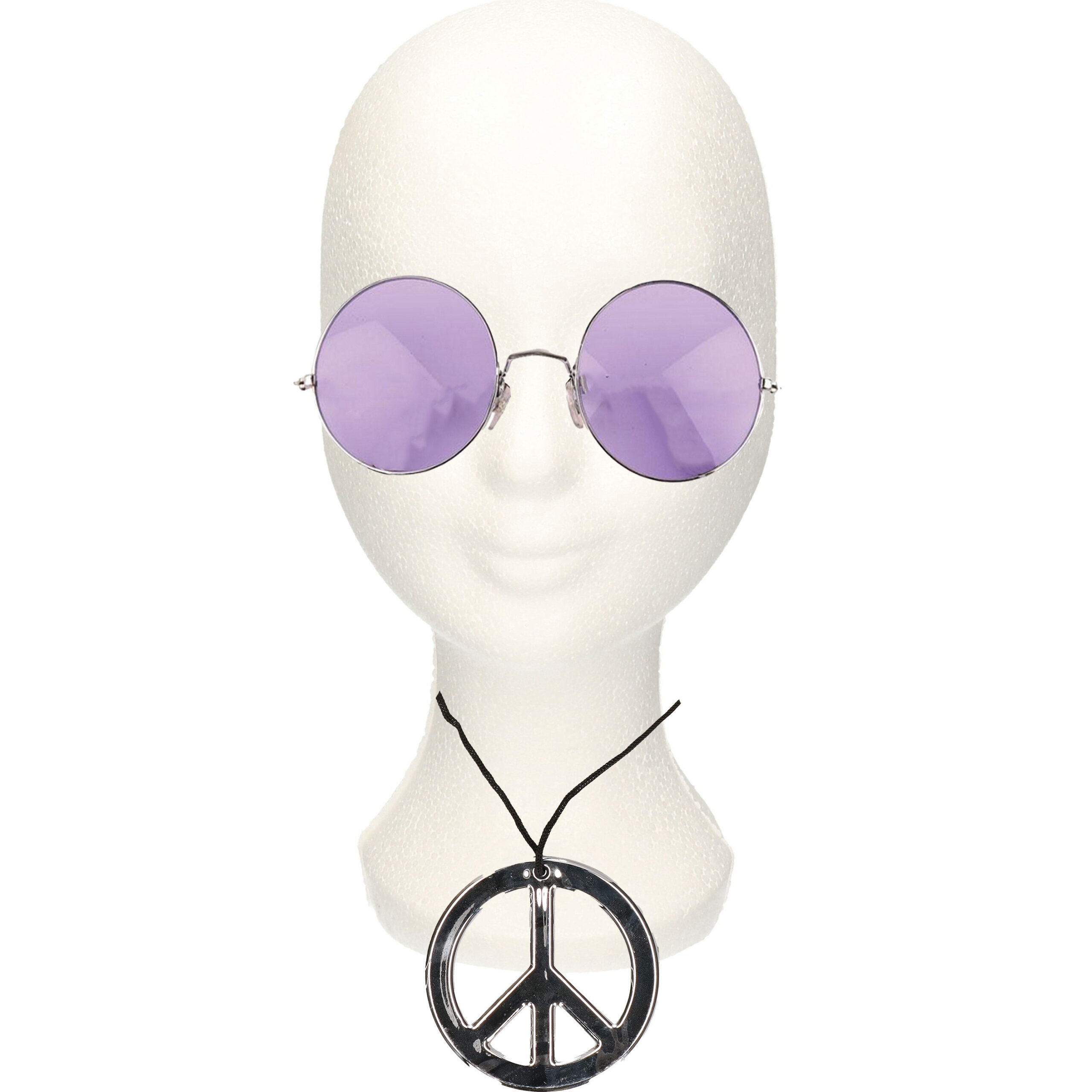 Hippie Flower Power thema verkleed set voor volwassenen bestaande uit een peace-teken ketting met een party ronde zonnebril met paarse XL glazen. Let op: dit is een verkleedaccessoire voor volwassenen, geen speelgoed. , Dit artikel bestaat uit:, 1x Hippie Flower Power Peace teken verkleed ketting, 1x Party zonnebril – Hippie Flower Power Sixties – grote XL ronde glazen – paars