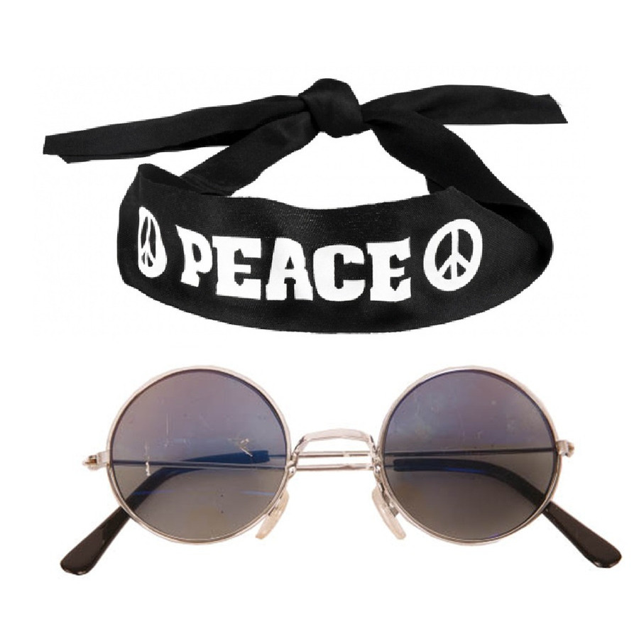 Hippie Flower Power verkleedset hoofdband met ronde glazen bril antraciet. Hippie/sixties verkleedkleding basis set. Let op: dit is een verkleedaccessoire voor volwassenen, geen speelgoed. , Dit artikel bestaat uit:, 1x Flower Power Hippie stijl hoofd/haarband – volwassenen – zwart – carnaval verkleed artikel, 1x Faram Party carnaval zonnebril – Hippie Flower Power Sixties – ronde glazen – grijs