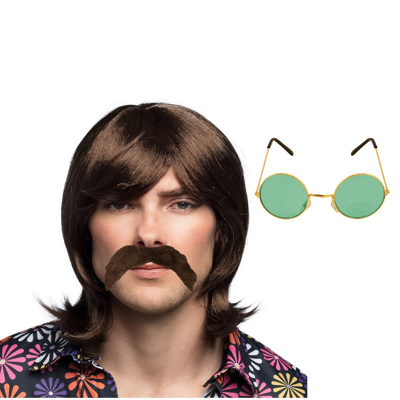 Hippie Flower Power Sixties verkleed set voor heren bestaande uit een verkleedpruik met lang haar en snor in het bruin en een bril met ronde glazen in het groen. Materiaal: polyester/metaal. Zo ben je snel helemaal in je rol. Carnaval thema verkleedkleding accessoires voor heren. Wat je nog kan toevoegen: jasje, broek of kostuum, joint, sieraden. , Dit artikel bestaat uit:, 1x Carnaval verkleedbril – ronde glazen – groen – flower power – hippie, 1x Carnaval verkleed snorren – hippie – old school – donkerbruin – zelfklevende namaak snor, 1x Verkleedpruik voor heren – bruin – Eighties/Seventies/Sixties – Carnaval – half lang haar