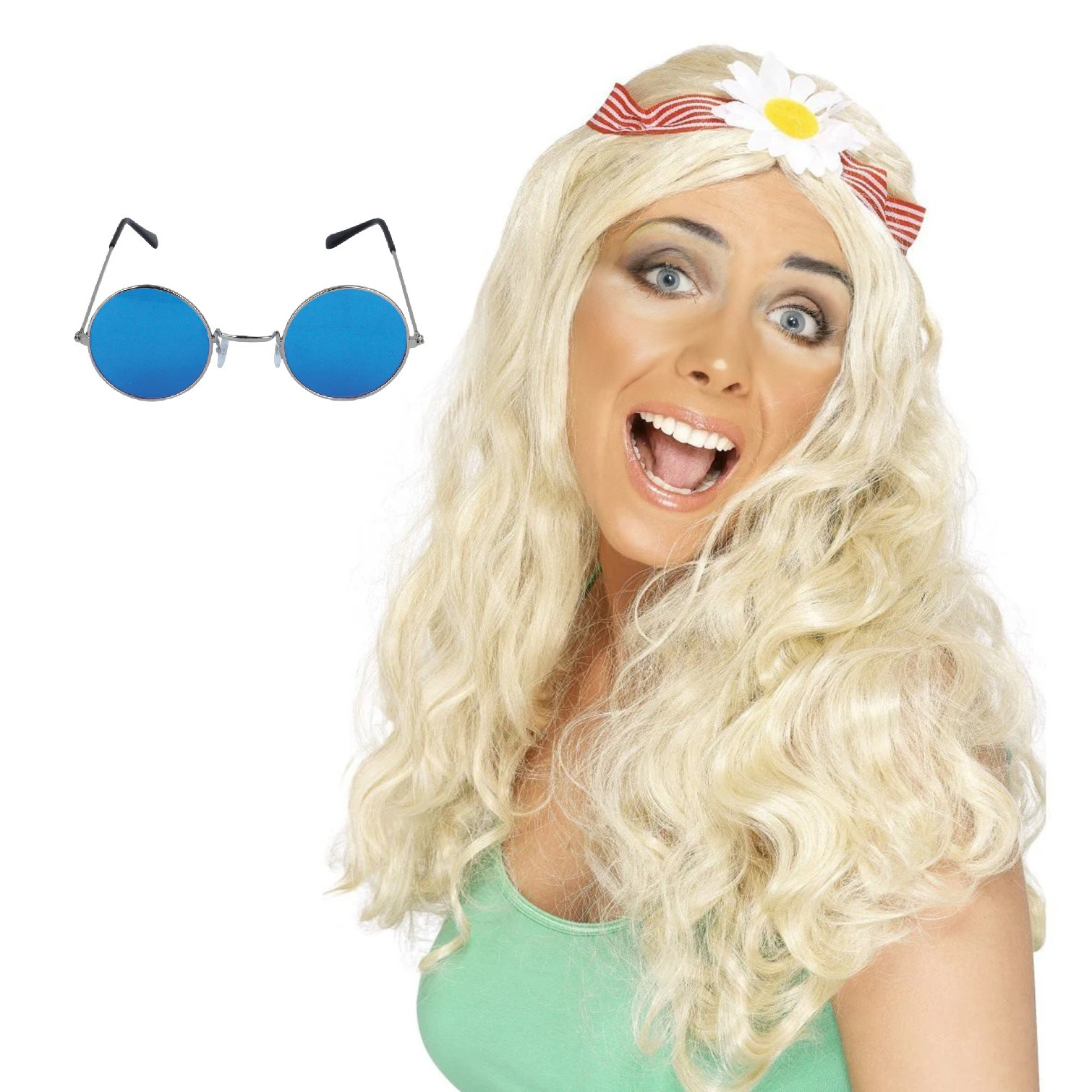 Hippie Flower Power Sixties verkleed set voor dames bestaande uit een verkleedpruik met lang blond haar en een hippie bril met ronde glazen in het blauw. Materiaal: polyester/metaal. Zo ben je snel helemaal in je verkleed thema. Carnaval thema verkleedkleding accessoires voor dames. Wat je nog kan toevoegen: jasje, broek of kostuum, jointje en sieraden. , Dit artikel bestaat uit:, 1x Smiffys carnaval verkleed damespruik – Blond – met haarbloem – Sixties style – Hippie, 1x Carnaval verkleedbril – ronde glazen – blauw – flower power – hippie