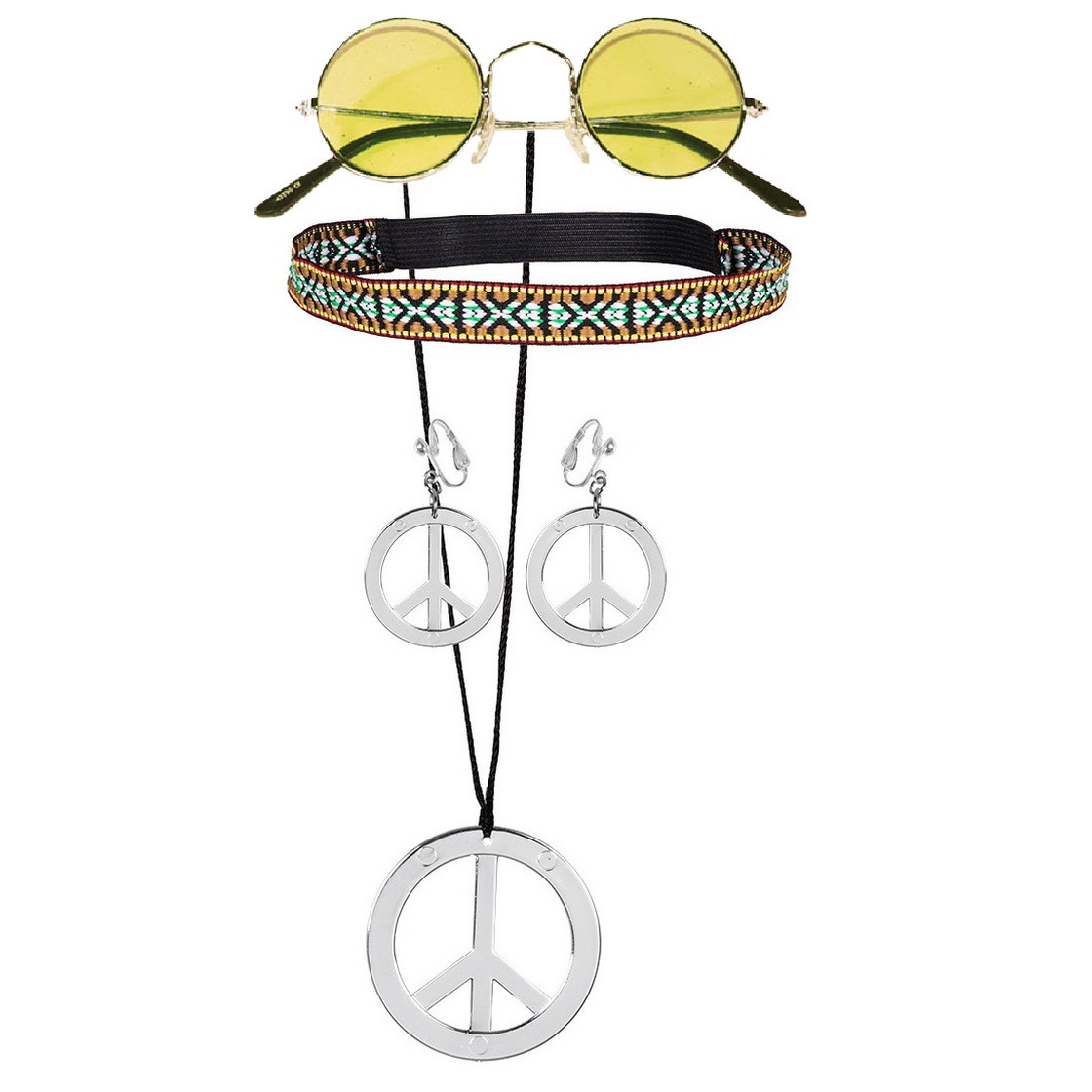 Hippie Flower Power Sixties verkleed accessoires set voor dames bestaande uit een haarbandje, peace teken ketting en oorbellen in het zilver en een bril met ronde glazen in het geel. Materiaal: kunststof/metaal. Zo ben je snel helemaal in je rol. Carnaval thema verkleedkleding accessoires voor dames. Wat je nog kan toevoegen: kostuum, joint, pruik, hoed. , Dit artikel bestaat uit:, 1x Faram Party carnaval zonnebril – Hippie Flower Power Sixties – ronde glazen – geel, 1x Carnaval/verkleed accessoires Hippie/sixties sieraden set – ketting/oorbellen/haarband