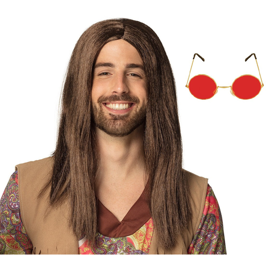 Hippie Flower Power Sixties verkleed set voor heren bestaande uit een verkleedpruik met lang haar bruin en een bril met ronde glazen in het rood. Materiaal: polyester/metaal. Zo ben je snel helemaal in je rol. Carnaval thema verkleedkleding accessoires voor heren. Wat je nog kan toevoegen: jasje, broek of kostuum, joint, sieraden. , Dit artikel bestaat uit:, 1x Carnaval verkleedbril – ronde glazen – rood – flower power – hippie, 1x Verkleedpruik Dude voor heren – bruin – Hippie/Sixties/Zwerver – Carnaval – lang haar