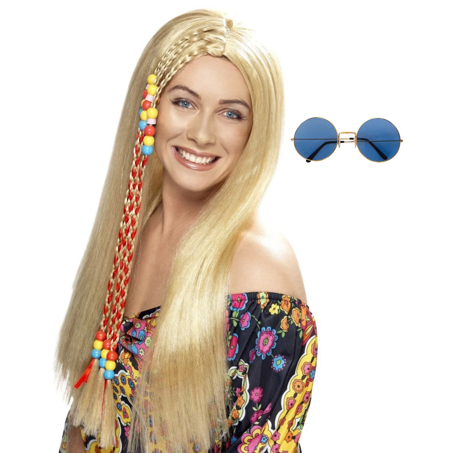 Hippie Flower Power Sixties verkleed set voor dames bestaande uit een verkleedpruik met lang blond haar en kralen en een hippie bril met ronde glazen in het blauw. Materiaal: polyester/metaal. Zo ben je snel helemaal in je verkleed thema. Carnaval thema verkleedkleding accessoires voor dames. Wat je nog kan toevoegen: jasje, broek of kostuum, jointje en sieraden. , Dit artikel bestaat uit:, 1x Lange blonde hippie pruik – voor dames – pruiken – verkleed – vlechten – synthetisch, 1x Faram Hippie zonnebril – blauw – flower power – 60s – ronde glazen