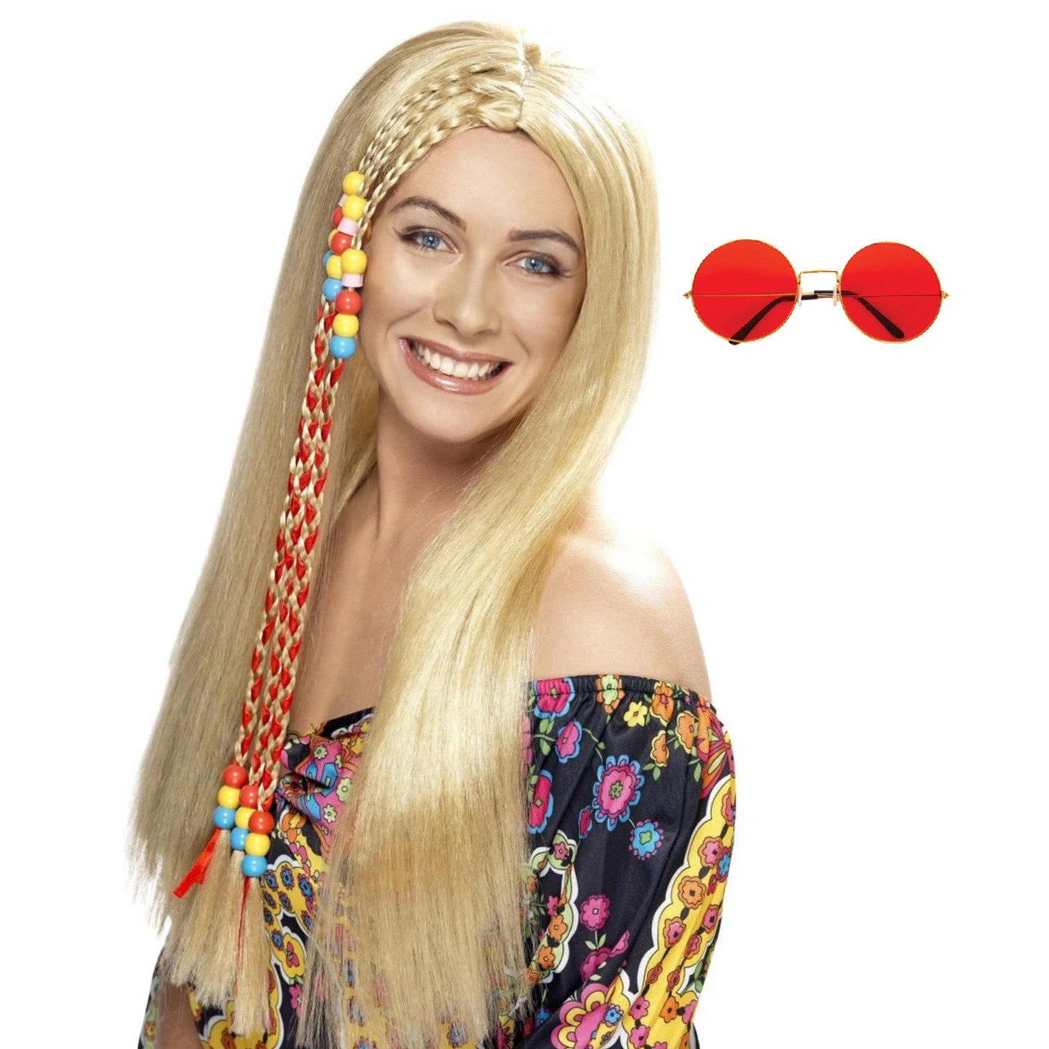 Hippie Flower Power Sixties verkleed set voor dames bestaande uit een verkleedpruik met lang blond haar en kralen en een hippie bril met ronde glazen in het rood. Materiaal: polyester/metaal. Zo ben je snel helemaal in je verkleed thema. Carnaval thema verkleedkleding accessoires voor dames. Wat je nog kan toevoegen: jasje, broek of kostuum, jointje en sieraden. , Dit artikel bestaat uit:, 1x Lange blonde hippie pruik – voor dames – pruiken – verkleed – vlechten – synthetisch, 1x Hippie Flower Power Sixties ronde glazen zonnebril rood