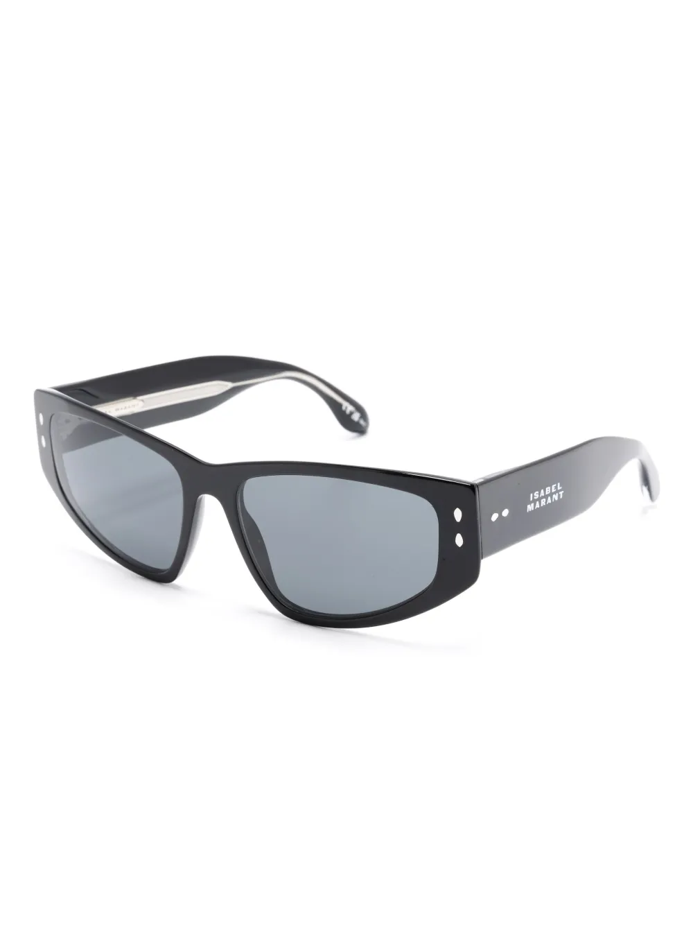 zwart acetaat D-montuur blauwe glazen rechte poten met logo-reliëf gebogen uiteinden Deze bril wordt verkocht met een beschermhoes.