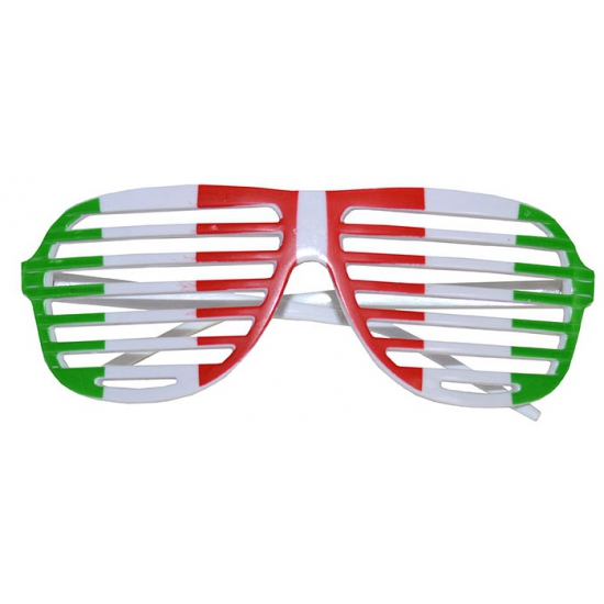Italie lamellen supporters zonnebril voor volwassenen. Deze bril voor volwassenen heeft de print groen wit rood van de Italiaanse vlag. Landen thema vlaggen verkleed feestartikelen. Let op: dit is een verkleedaccessoire voor volwassenen, beschermt niet tegen de zon en is niet geschikt voor kinderen.