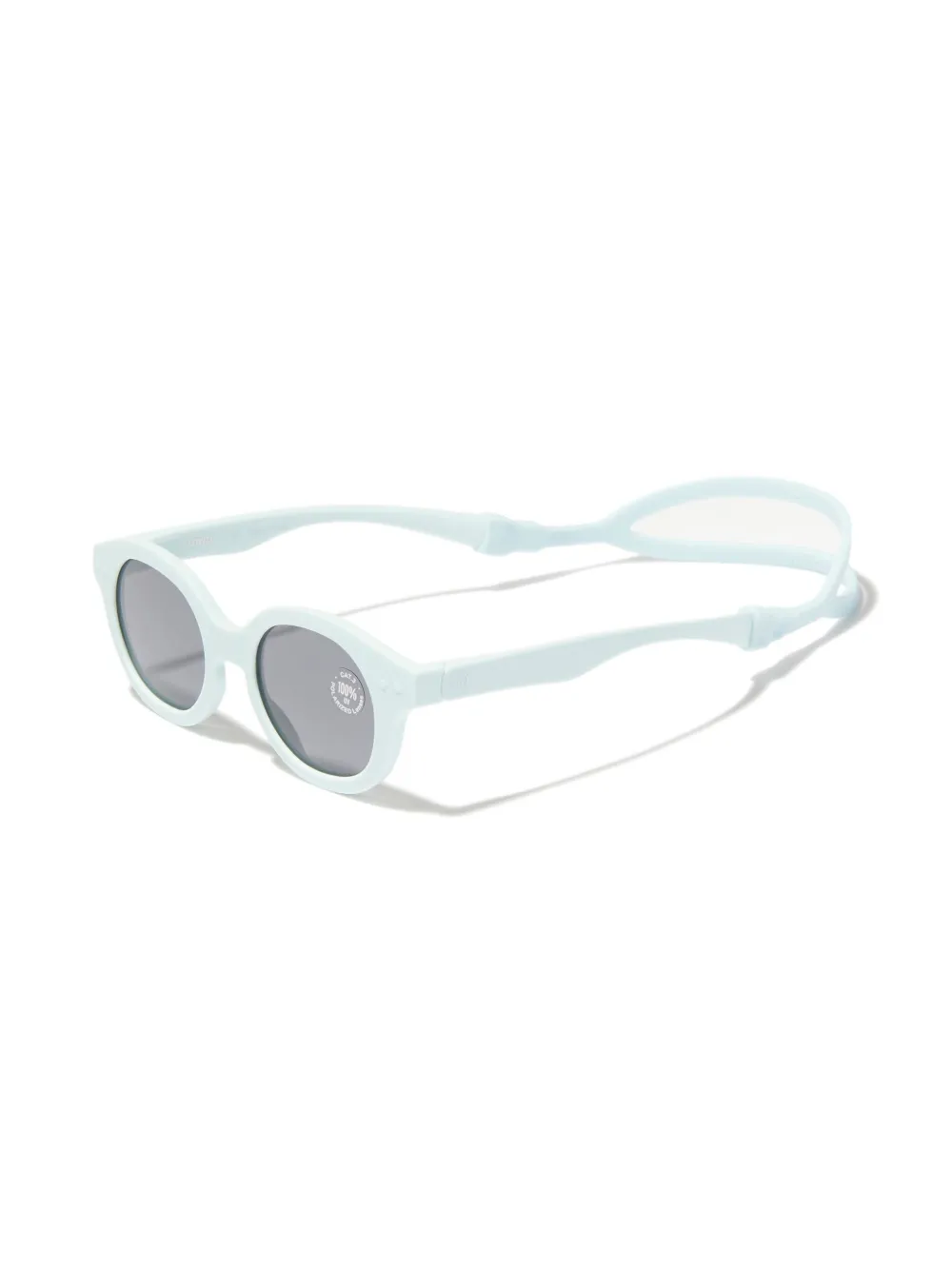 Lichtblauw, rond montuur, gekleurde glazen, glazen met UV-bescherming, rechte pootjes en gebogen uiteinde. Deze bril wordt verkocht met een beschermhoes..