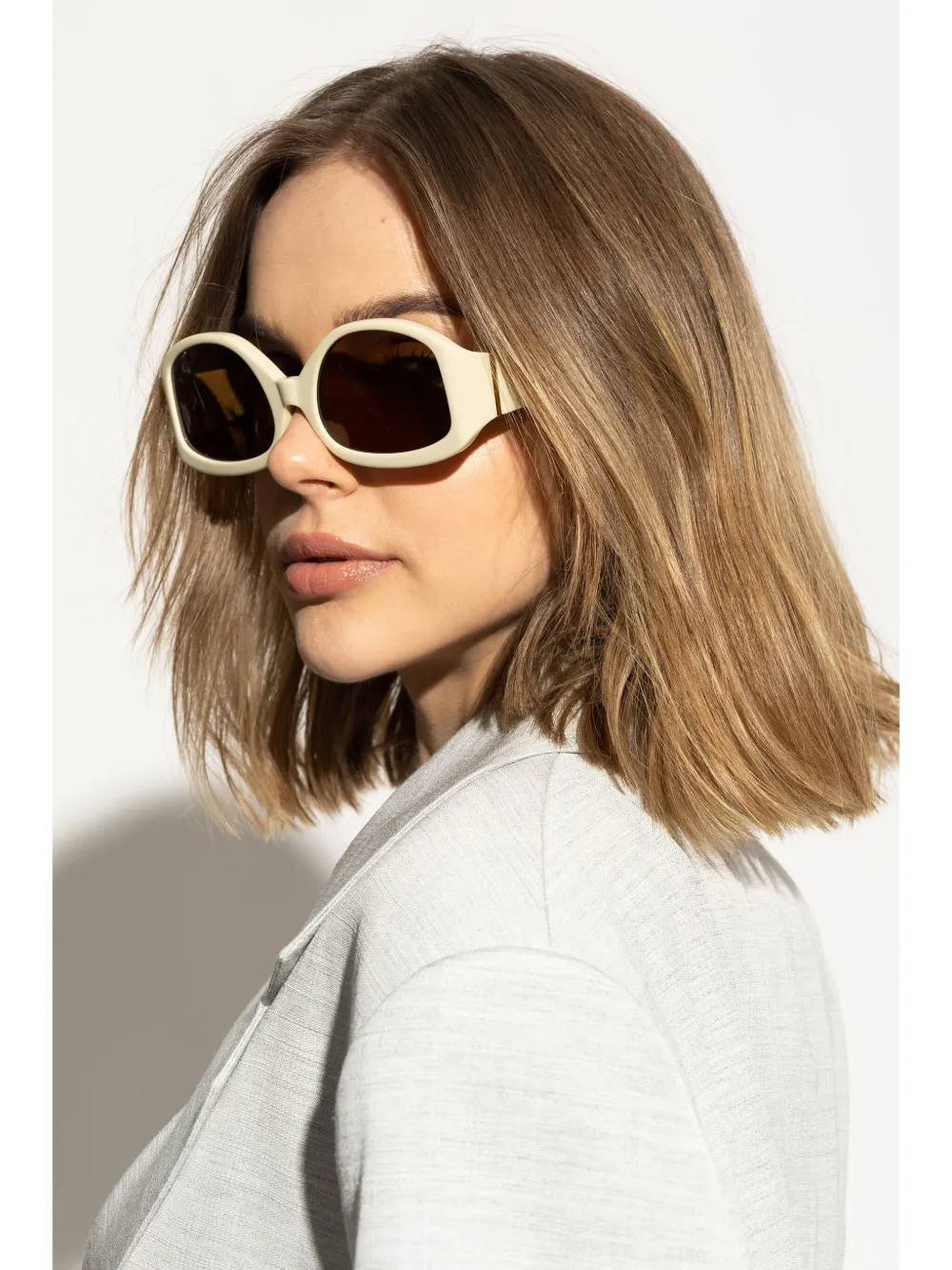 lichtbeige bruine glazen pootje met gegraveerd logo logoplakkaat op de mouw cat-eye montuur rechte pootjes