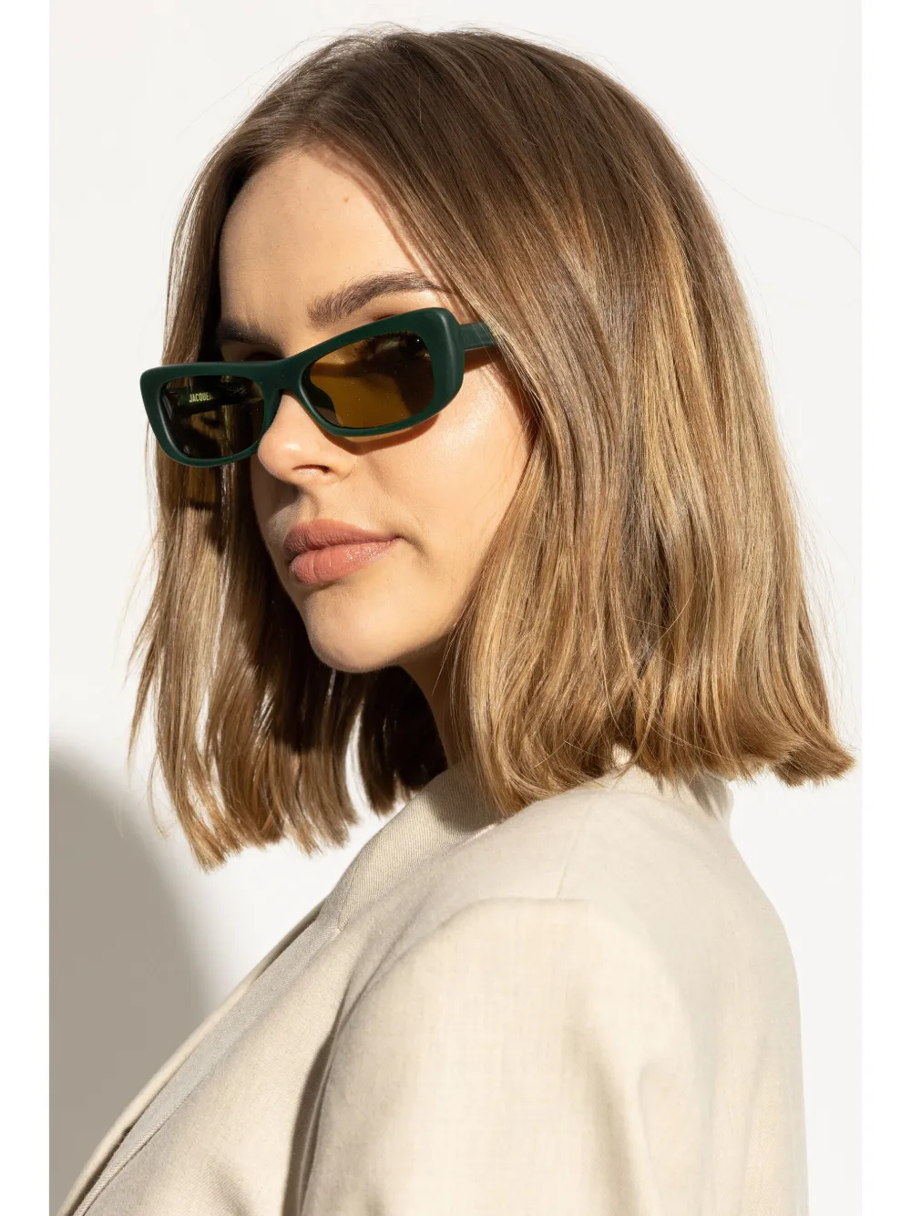 donkergroen acetaat rechthoekig montuur bruine glazen glazen met UV-bescherming goudkleurig logo rechte pootjes afgeronde zoom