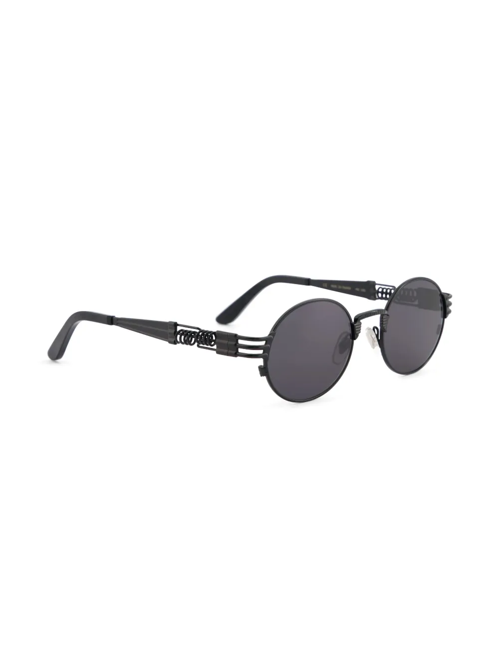 Zwart, metaal, rond montuur, neuskussentjes, gewelfde pootjes en grijze glazen. Deze bril wordt verkocht met een beschermhoes.. Als je dit uniseks item wilt kopen, wees ervan bewust dat het matensysteem voor heren wordt gebruikt..