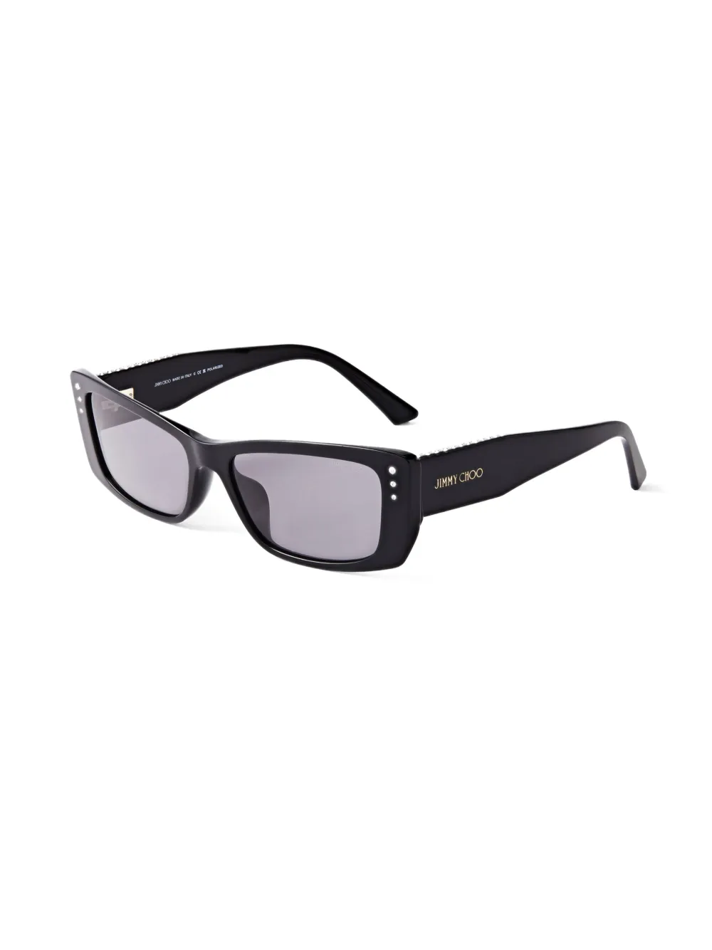 zwart acetaat verfraaid met kristallen rechthoekig montuur grijze glazen glazen met UV-bescherming pootje met gegraveerd logo bewerkte poten met gewelfde uiteinden Deze bril wordt verkocht met een beschermhoes.