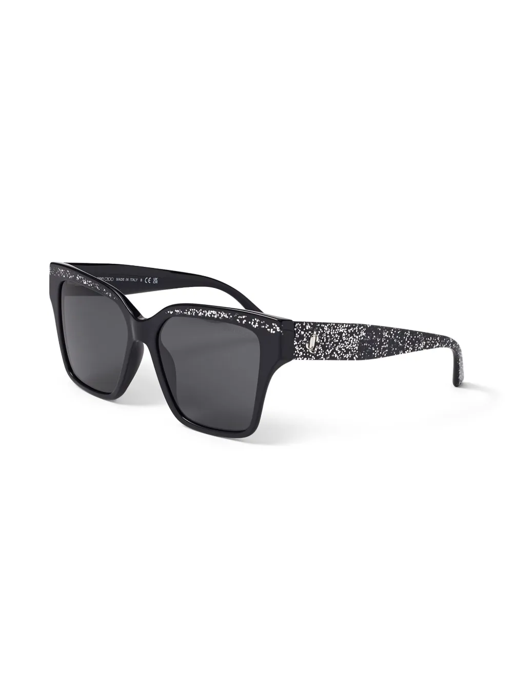 donkergrijs acetaat glitterdetail zilverkleurig logo vierkant montuur gekleurde glazen rechte pootjes gebogen uiteinden Deze bril wordt verkocht met een beschermhoes.