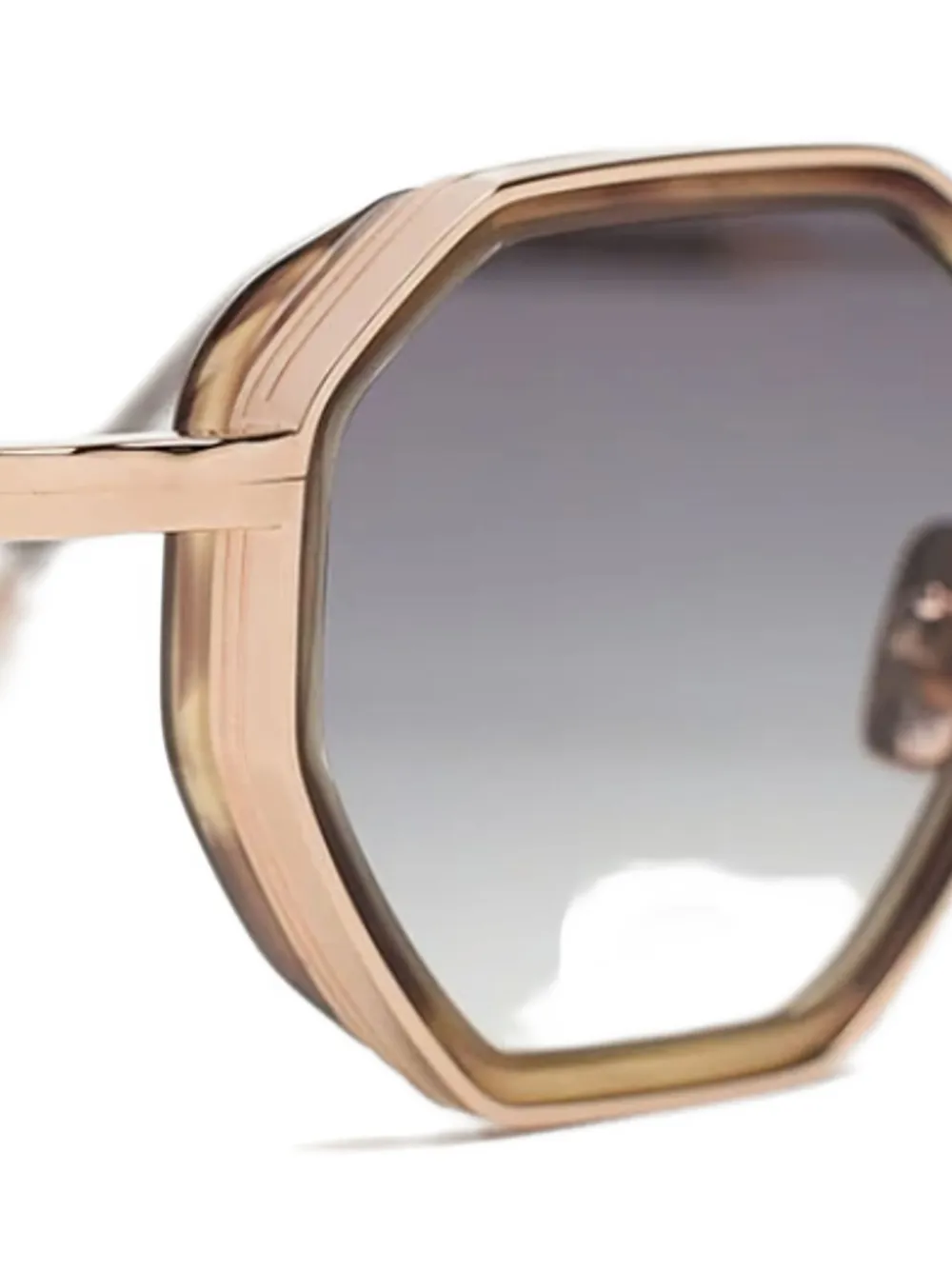 zwart geometrisch montuur roségouden metalen pootjes bruin acetaat detail glazen met kleurverloop uiteinden van de pootjes Deze bril wordt verkocht met een beschermhoes.
