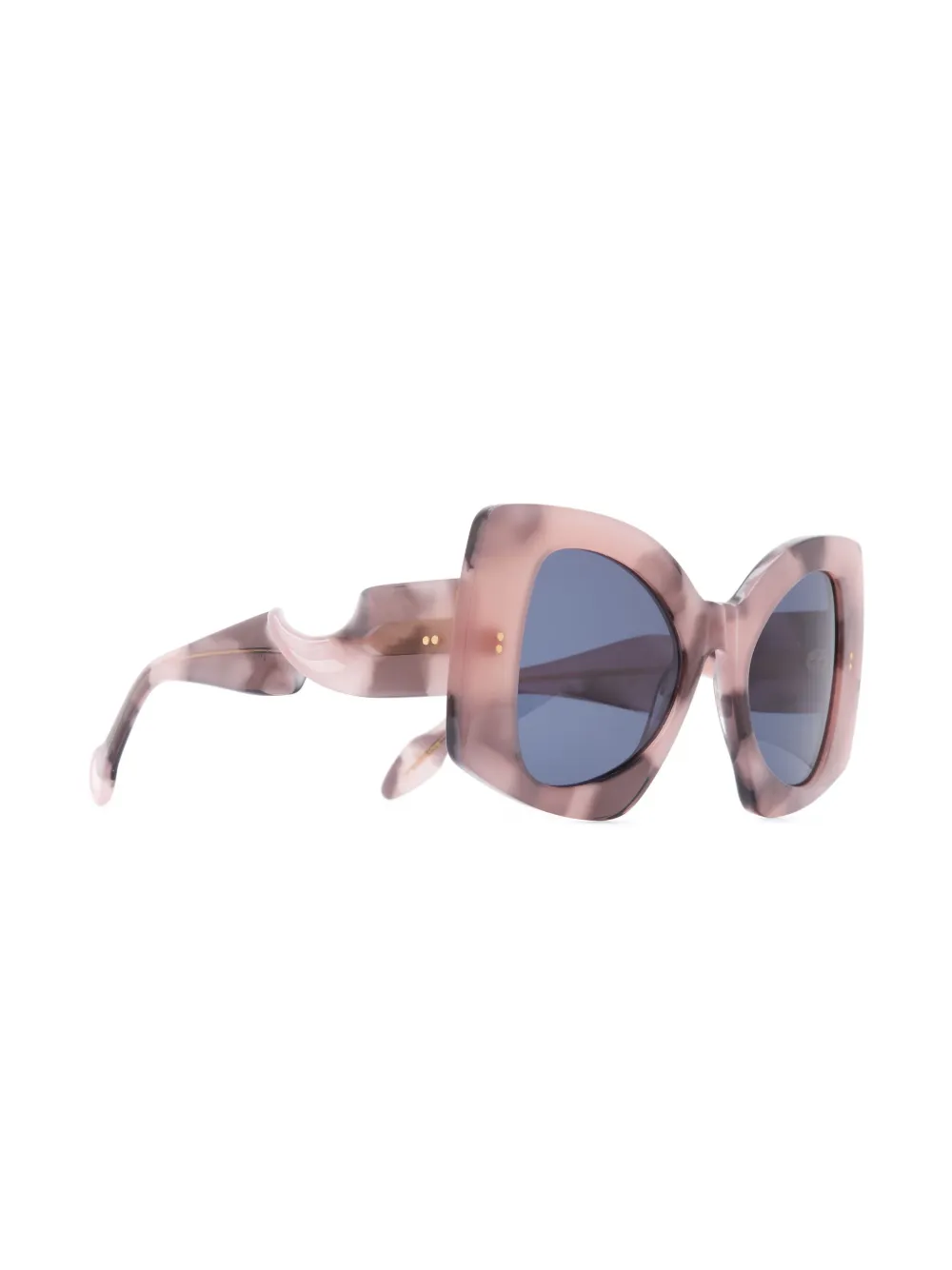 poederroze acetaat schildpad montuur oversized montuur blauwe glazen gedraaide details gewelfde pootjes gebogen uiteinden Deze bril wordt verkocht met een beschermhoes.