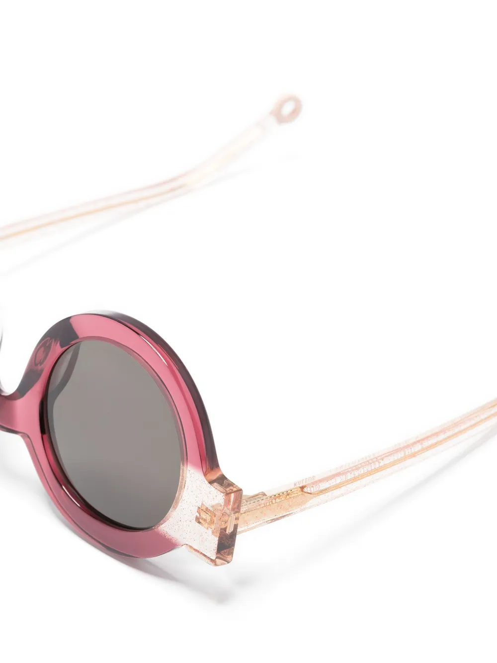 Framboosroze, acetaat, rond montuur, gekleurde glazen, glazen met UV-bescherming, tweekleurig design, glitterdetails, doorzichtig ontwerp, rechte pootjes en gebogen uiteinde. Deze bril wordt verkocht met een beschermhoes..