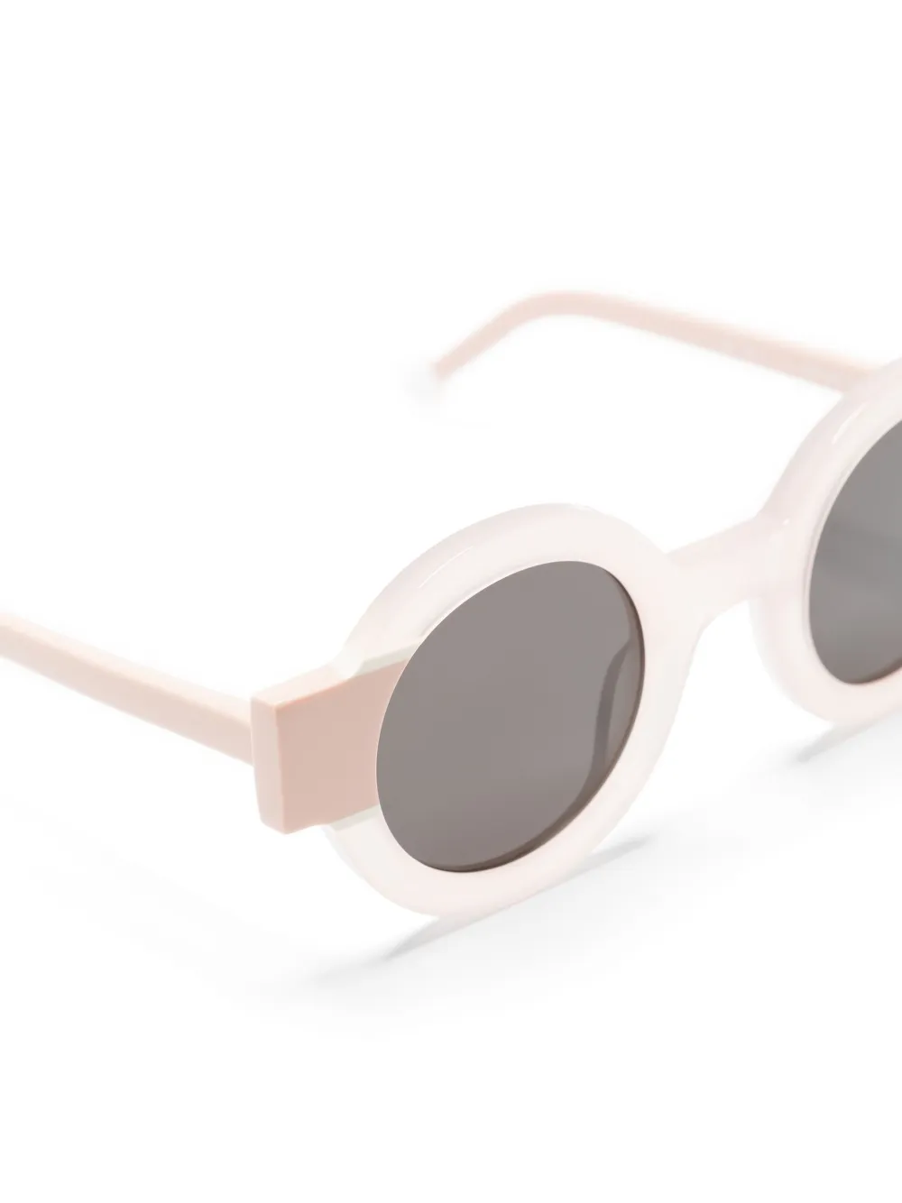 Lichtroze, acetaat, doorzichtig ontwerp, tweekleurig detail, rond montuur, gekleurde glazen, glazen met UV-bescherming, goudkleurig materiaal, rechte pootjes en gebogen uiteinde. Deze bril wordt verkocht met een beschermhoes..