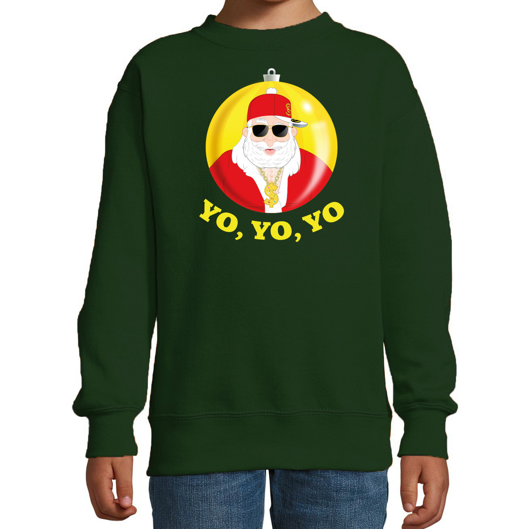 Kersttrui/sweater groen voor kinderen. Deze grappige Kerst sweater is bedrukt met het print van een coole kerstman die een pet, zonnebril en gouden chain (ketting) draagt en de tekst: Yo, Yo, Yo.