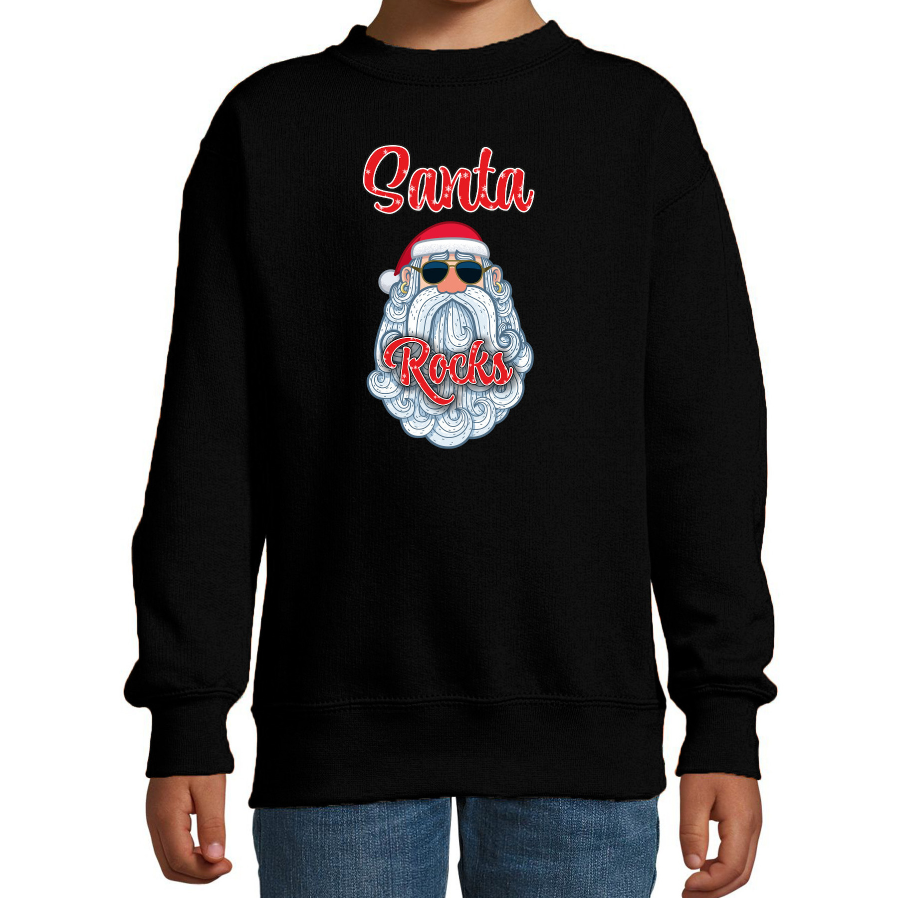 Kersttrui/sweater zwart voor kinderen. De Kerst sweater is bedrukt met het print van een coole Kerstman met zonnebril en de tekst: Santa Rocks.