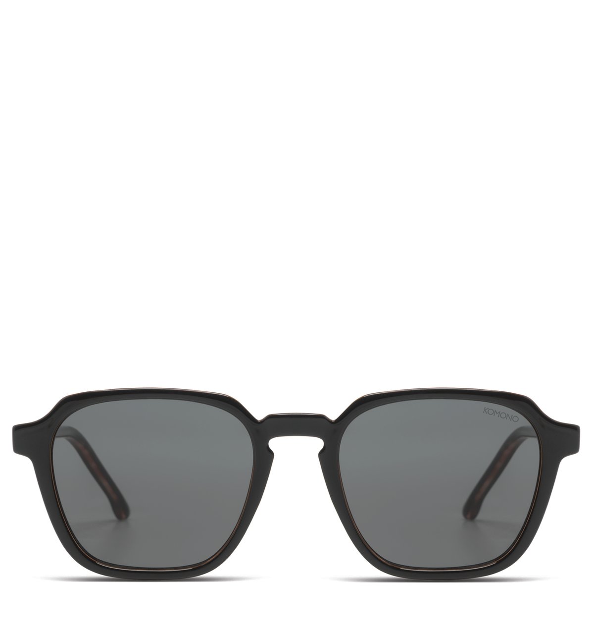 Een zwarte zonnebril van het merk KOMONO. De Matty Black Tortoise heeft 100% UV400-bescherming en een krasbestendige pc-lens.