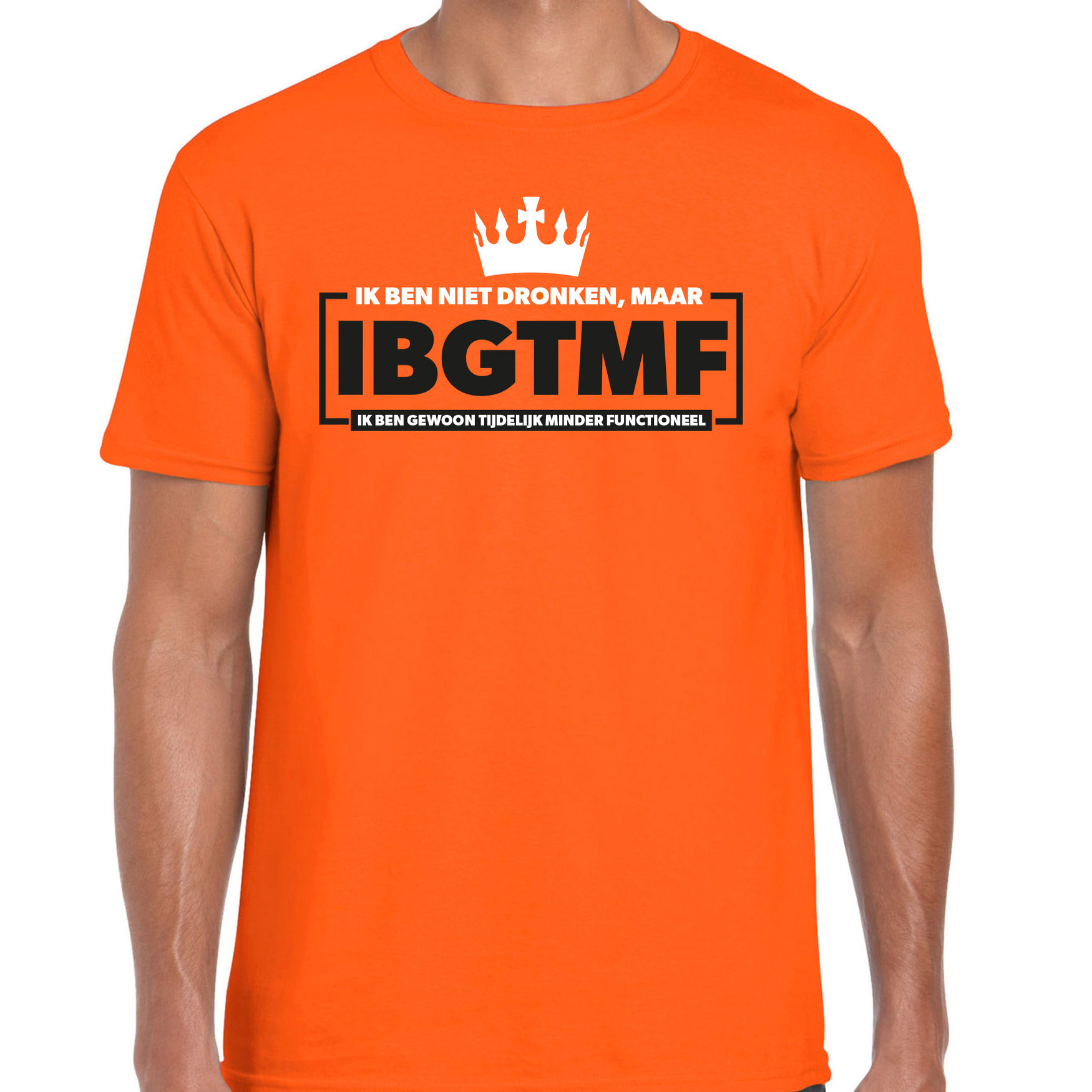 Met dit oranje Koningsdag t-shirt hoef je niets meer uit te leggen, de tekst “ik ben niet dronken maar Ik ben gewoon tijdelijk minder functioneel” (IBGTMF) zegt alles! Perfect voor een dag waarop feestvieren de hoogste prioriteit heeft. Of je nu op de vrijmarkt slentert, een biertje drinkt met vrienden of losgaat op de muziek, dit shirt maakt meteen duidelijk in welke feestmodus jij zit. Dankzij de pasvorm zie je er nog steeds stijlvol uit, zelfs als je functioneren even op een lager pitje staat. Vandaag even minder functioneel, maar 100% klaar voor een topfeest! Materiaal: 100% katoen, 145 grams kwaliteit. Merk: Bellatio Decorations.