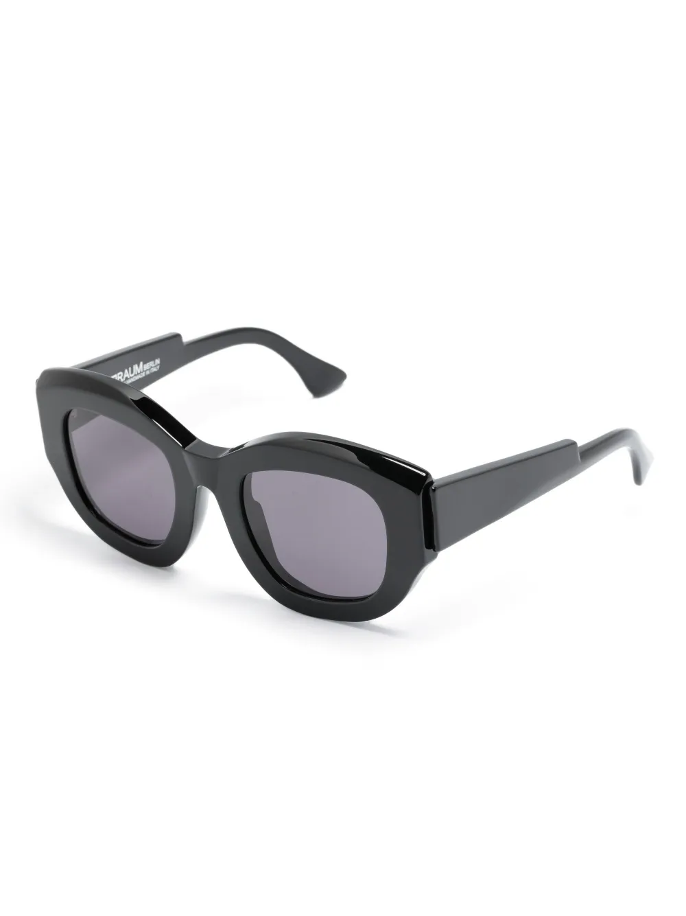 Zwart, acetaat, grijze glazen, cat-eye montuur, geschulpte pootjes en gebogen uiteinde. Deze bril wordt verkocht met een beschermhoes..