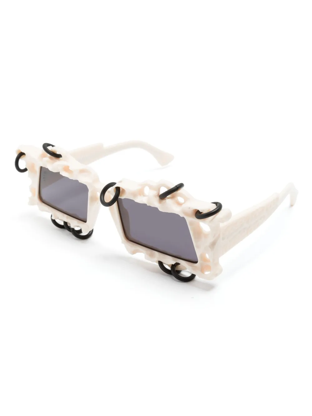 crèmewit acetaat handgemaakte afwerking geperforeerd detail verfraaid met meerdere ringen geometrisch montuur grijze glazen bewerkte pootjes en gewelfde uiteinden Deze bril wordt verkocht met een beschermhoes.
